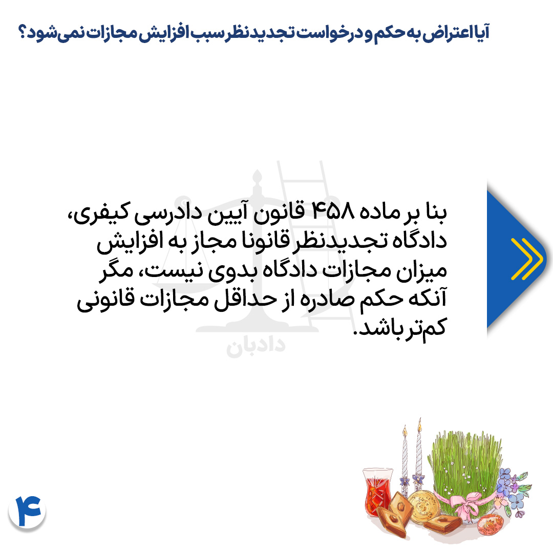 در همین زمینه بنا بر ماده ۴۵۸ قانون آیین دادرسی کیفری، دادگاه تجدیدنظر قانونا مجاز به افزایش میزان مجازات دادگاه بدوی نیست، مگر آنکه حکم صادره از حداقل مجازات قانونی کمتر باشد.