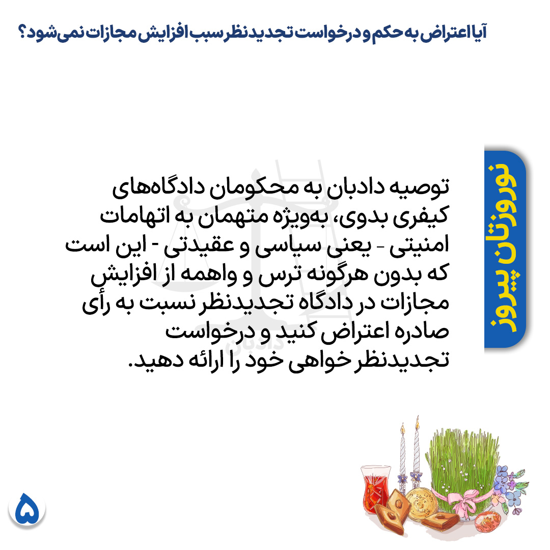 از این رو توصیه دادبان به محکومان دادگاههای کیفری بدوی به ویژه متهمان به اتهامات امنیتی (سیاسی و عقیدتی) این است، که بدون هرگونه ترس و واهمه از افزایش مجازات در دادگاه تجدیدنظر نسبت به رای صادره اعتراض کرده و درخواست تجدیدنظر خواهی خود را ارائه دهید.