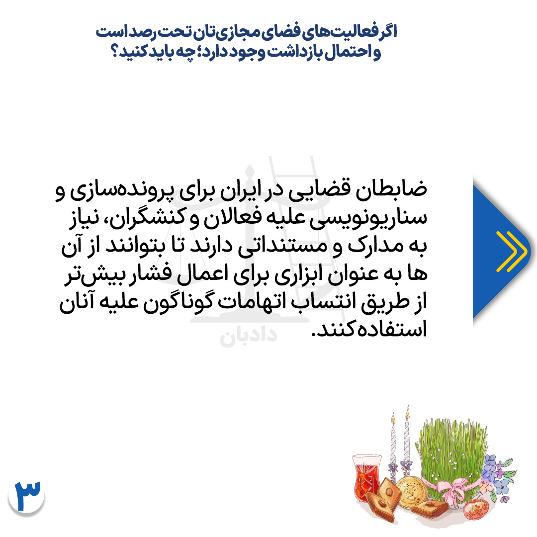 اقدامات ضروری برای افرادی که احتمال بازداشت خود را به دلیل فعالیت در فضای مجازی میدهند، از دیگر سوالاتی بود که در سال گذشته بارها از دادبان پرسیده شده است.