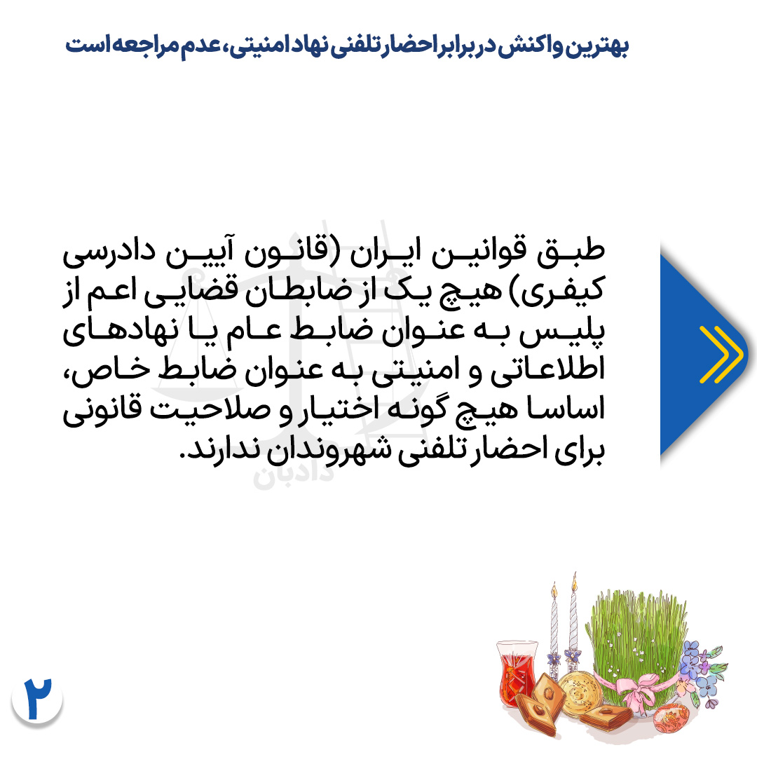 بنا بر قوانین موضوعه در ایران (قانون آیین دادرسی کیفری) هیچ یک از ضابطان قضایی اعم از پلیس به عنوان ضابط عام یا نهادهای اطلاعاتی و امنیتی به عنوان ضابط خاص، اساسا هیچ گونه اختیار و صلاحیت قانونی برای احضار تلفنی شهروندان ندارند.