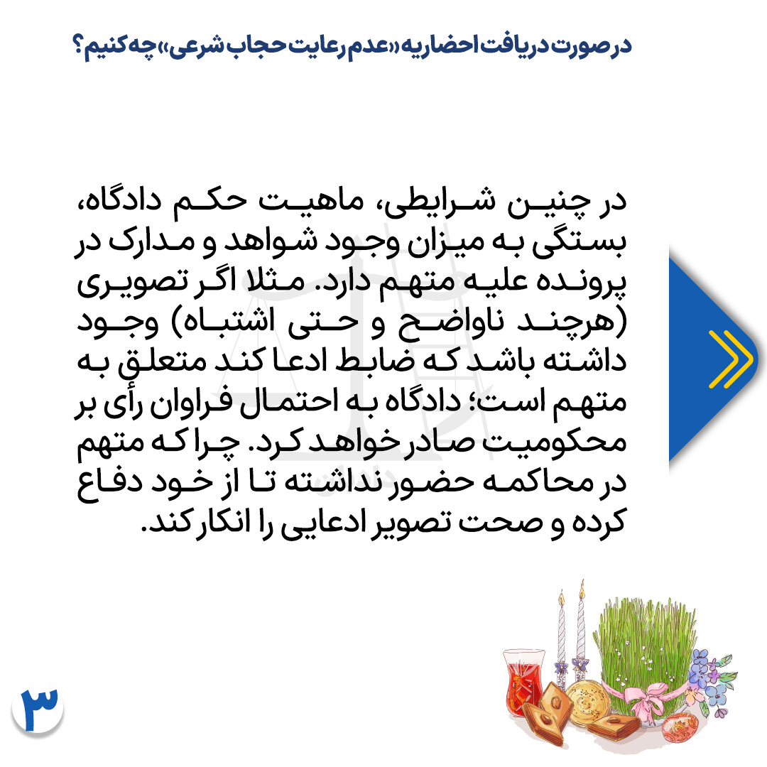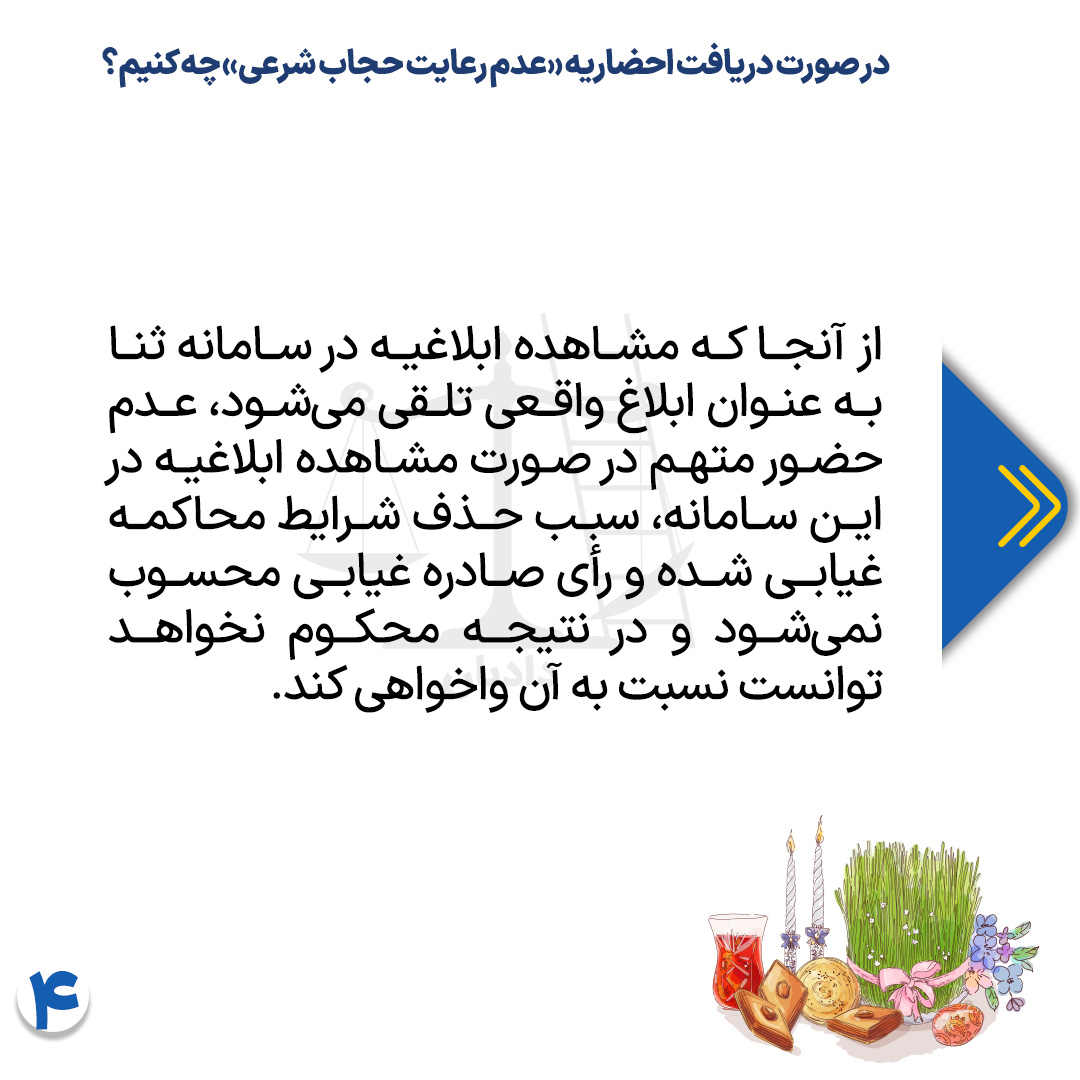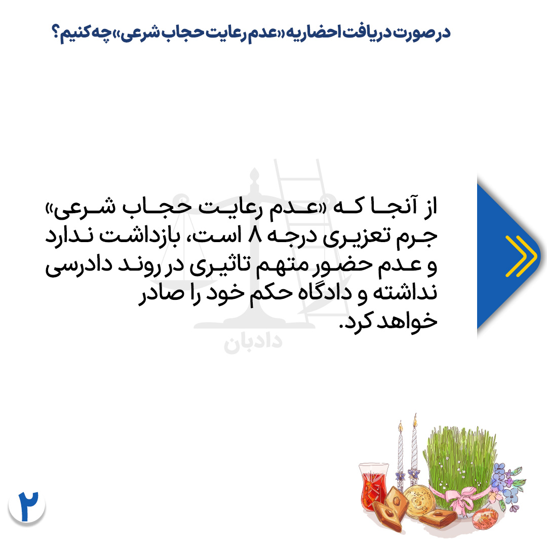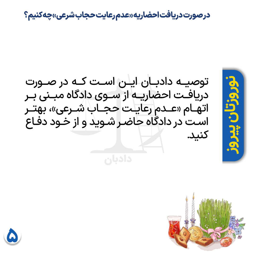 در نتیجه توصیه دادبان این است که در صورت دریافت احضاریه از سوی دادگاه مبنی بر اتهام «عدم رعایت حجاب شرعی»، بهتر است در دادگاه حاضر شده و از خود دفاع کنید.