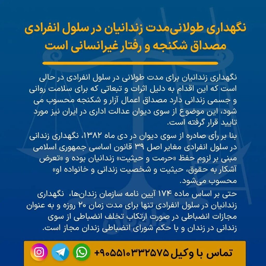 نگهداری زندانیان برای مدت طولانی در سلول انفرادی در حالی است که این اقدام به دلیل اثرات و تبعاتی که برای سلامت روانی و جسمی زندانی دارد مصداق اعمال آزار و شکنجه محسوب میشود، این موضوع از سوی دیوان عدالت اداری در ایران نیز مورد تایید قرار گرفته است. بنا بر رأی صادره از سوی […]