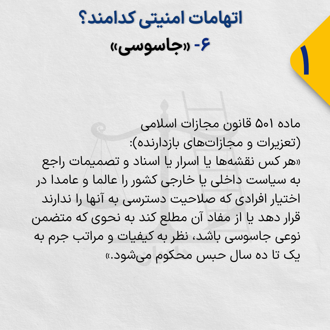 «هر کس نقشهها یا اسرار یا اسناد و تصمیمات راجع به سیاست داخلی یا خارجی کشور را عالما و عامدا در اختیار افرادی که صلاحیت دسترسی به آنها را ندارند قرار دهد یا از مفاد آن مطلع کند به نحوی که متضمن نوعی جاسوسی باشد، نظر به کیفیات و مراتب جرم به یک تا ده سال حبس محکوم میشود.»
