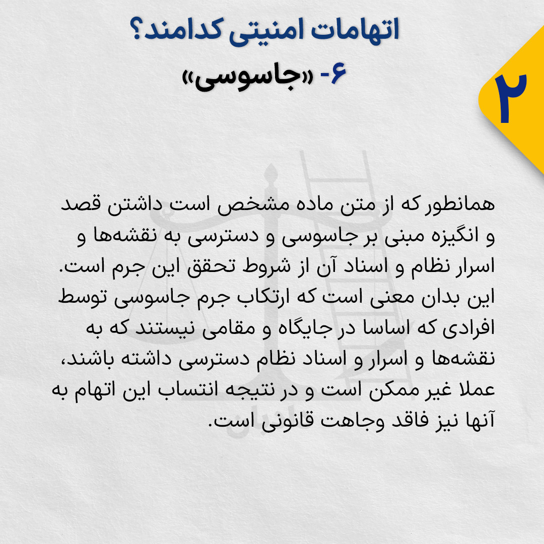 همانطور که از متن ماده مشخص است داشتن قصد و انگیزه مبنی بر جاسوسی و دسترسی به نقشهها و اسرار نظام و اسناد آن از شروط تحقق این جرم است. این بدان معنی است که ارتکاب جرم جاسوسی توسط افرادی که اساسا در جایگاه و مقامی نیستند که به نقشهها و اسرار و اسناد نظام دسترسی داشته باشند، عملا غیر ممکن است و در نتیجه انتساب این اتهام به آنها نیز فاقد وجاهت قانونی است.