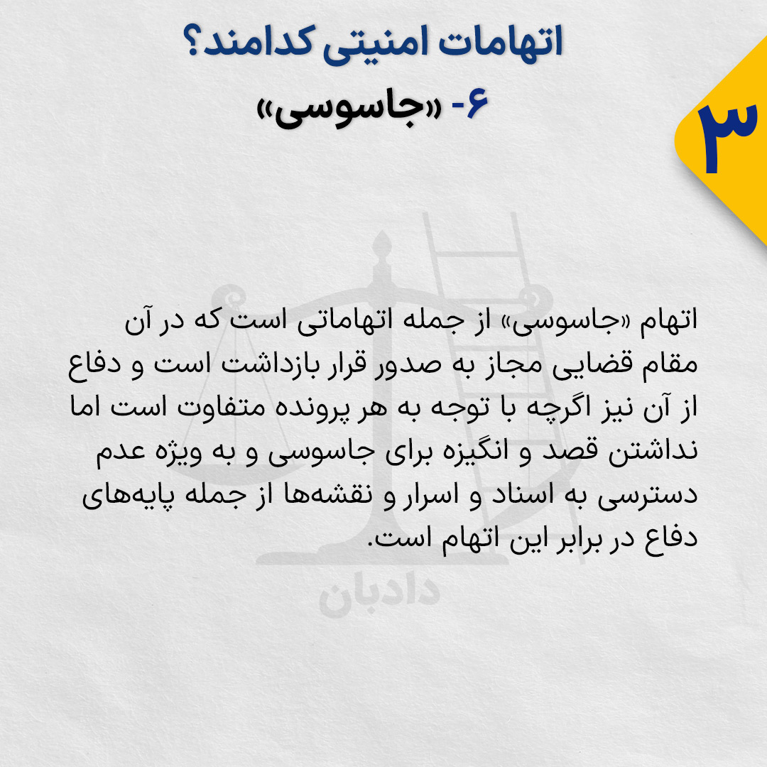 اتهام «جاسوسی» از جمله اتهاماتی است که در آن مقام قضایی مجاز به صدور قرار بازداشت است و دفاع از آن نیز اگرچه با توجه به هر پرونده متفاوت است اما نداشتن قصد و انگیزه برای جاسوسی و به ویژه عدم دسترسی به اسناد و اسرار و نقشهها از جمله پایههای دفاع در برابر این اتهام است.
