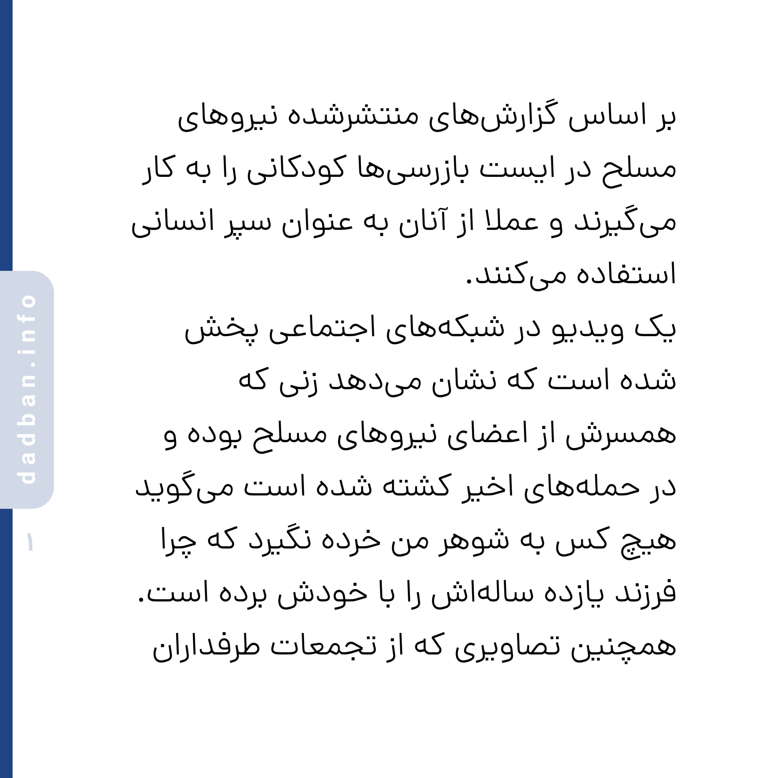 یک ویدیو در شبکههای اجتماعی پخش شده است که نشان میدهد زنی که همسرش از اعضای نیروهای مسلح بوده و در حملههای اخیر کشته شده است میگوید هیچ کس به شوهر من خرده نگیرد که چرا فرزند یازده سالهاش را با خودش برده است.