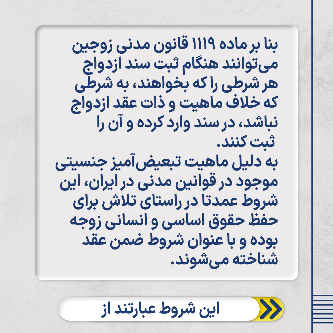 بنا بر ماده ۱۱۱۹ قانون مدنی زوجین می‌توانند هنگام ثبت سند ازدواج هر شرطی را که بخواهند، به شرطی که خلاف ماهیت و ذات عقد ازدواج نباشد، در سند وارد کرده و آن را ثبت کنند.