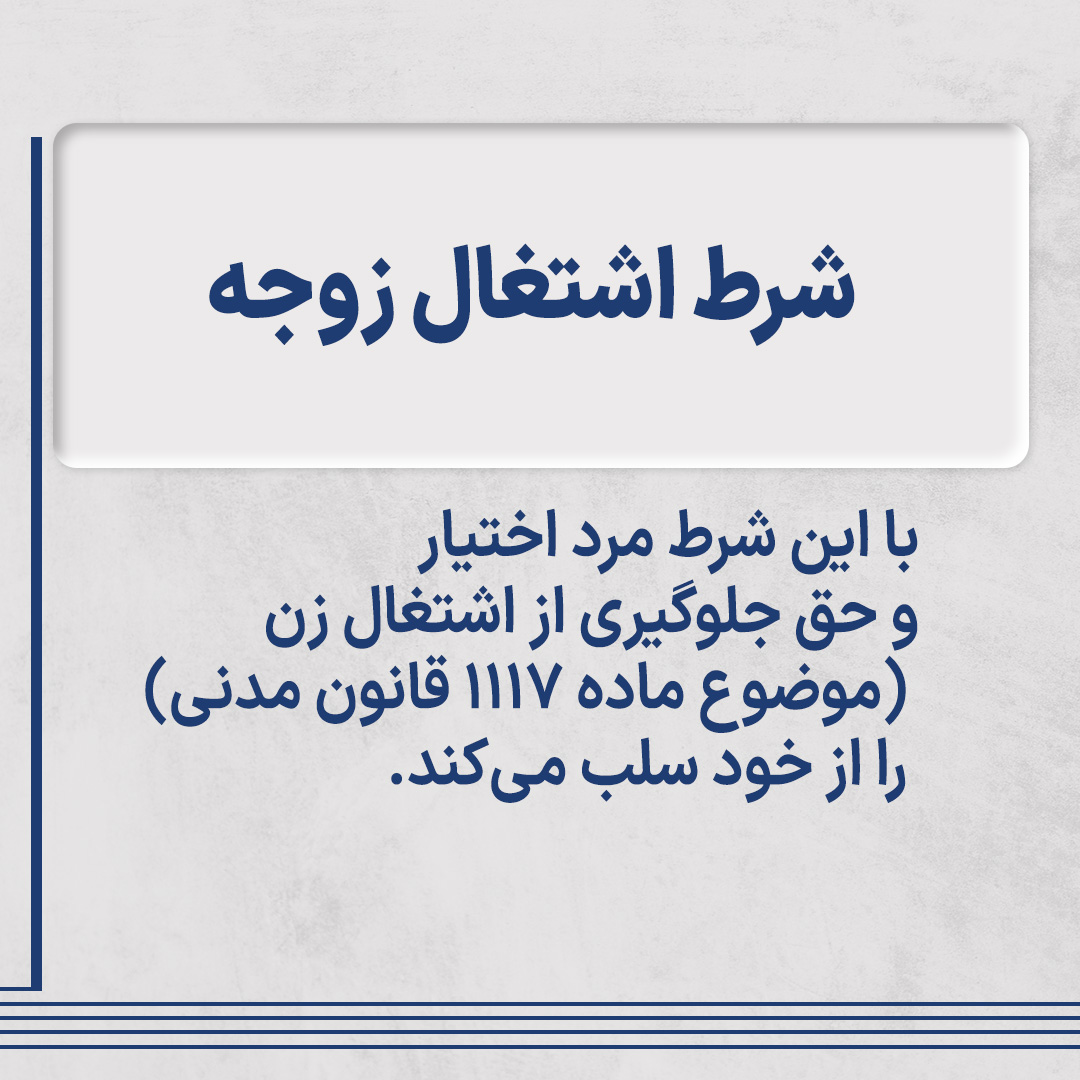 با این شرط مرد اختیار و حق جلوگیری از اشتغال زن (موضوع ماده ۱۱۱۷ قانون مدنی) را از خود سلب می‌کند.