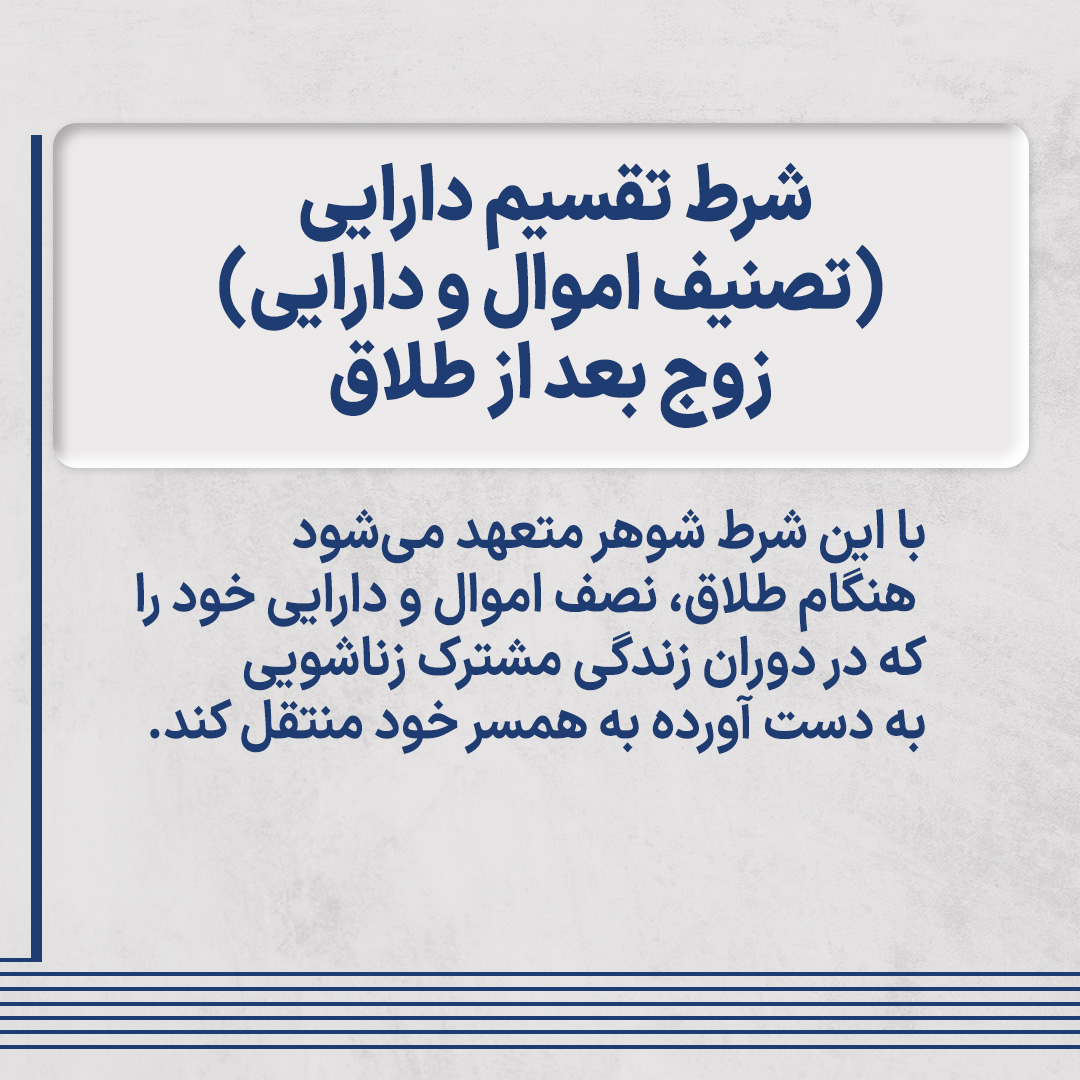– شرط تقسیم دارایی (تصنیف اموال و دارایی) زوج بعد از طلاق