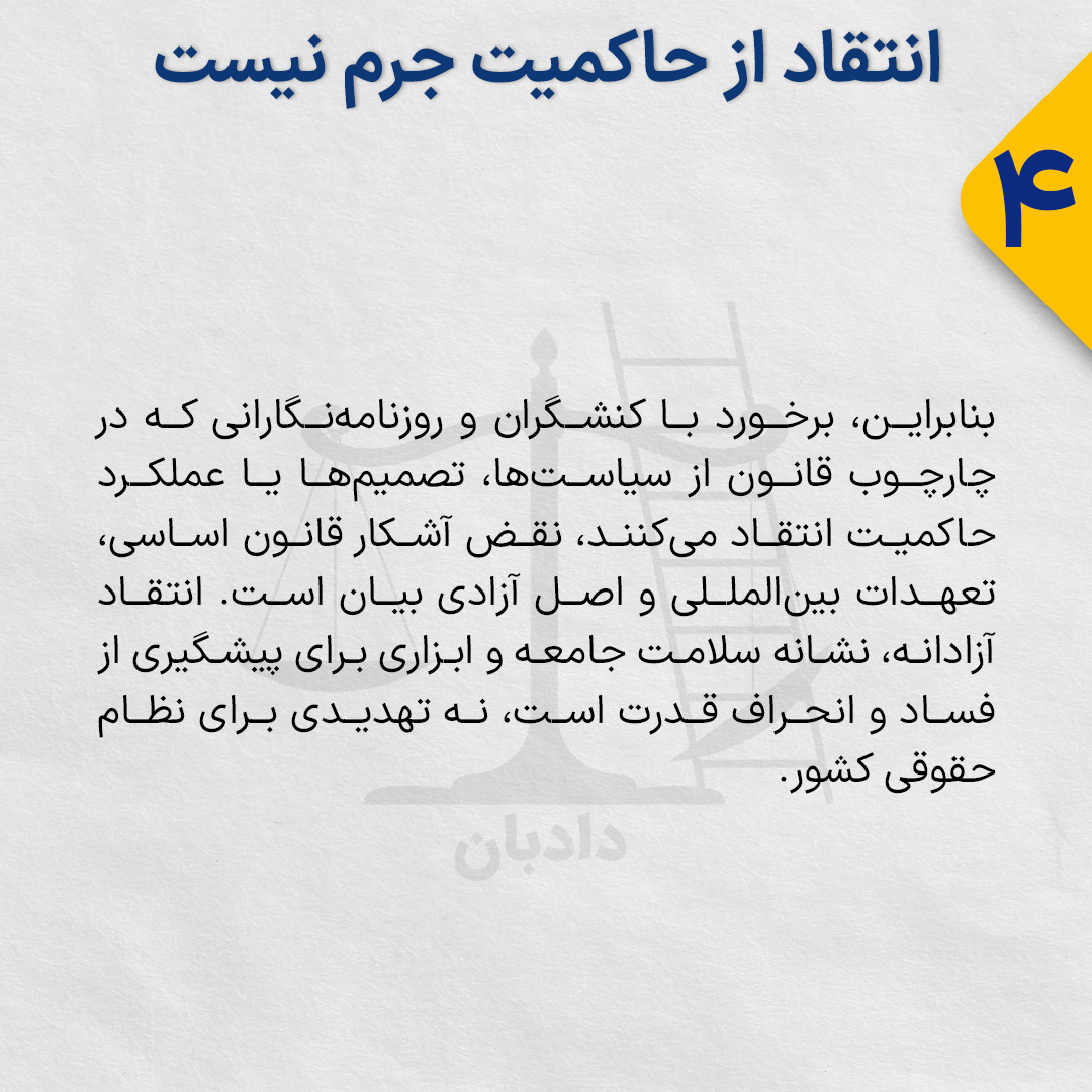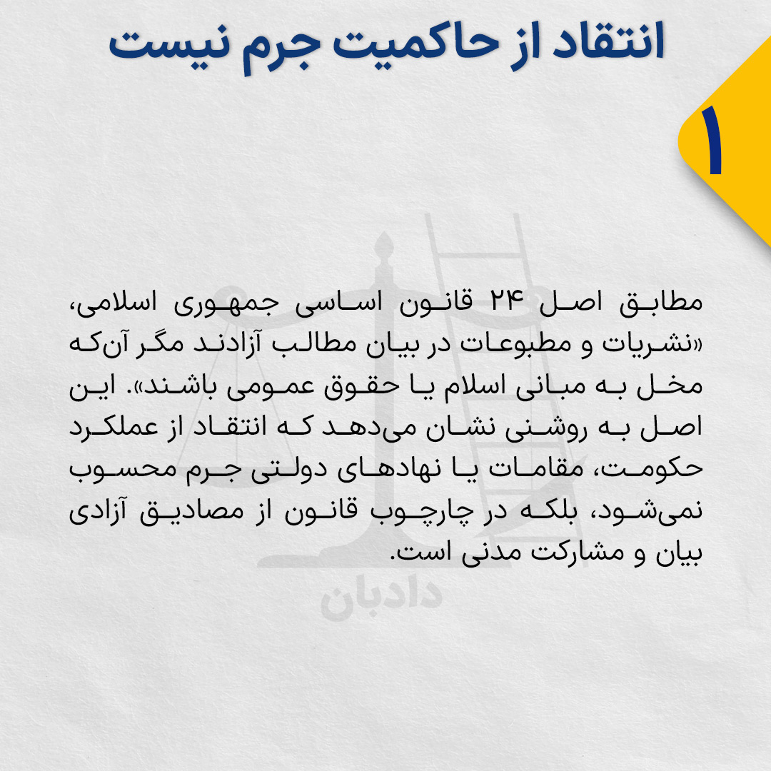 مطابق اصل ۲۴ قانون اساسی جمهوری اسلامی، «نشریات و مطبوعات در بیان مطالب آزادند مگر آنکه مخل به مبانی اسلام یا حقوق عمومی باشند». این اصل به روشنی نشان میدهد که انتقاد از عملکرد حکومت، مقامات یا نهادهای دولتی جرم محسوب نمیشود، بلکه در چارچوب قانون از مصادیق آزادی بیان و مشارکت مدنی است.