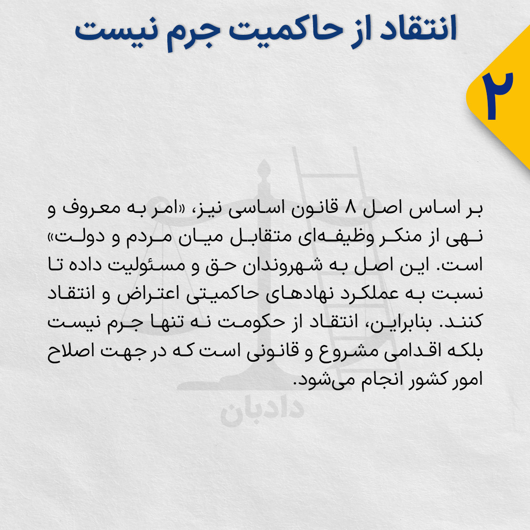 بر اساس اصل ۸ قانون اساسی نیز، «امر به معروف و نهی از منکر وظیفهای متقابل میان مردم و دولت» است. این اصل به شهروندان حق و مسئولیت داده تا نسبت به عملکرد نهادهای حاکمیتی اعتراض و انتقاد کنند. بنابراین، انتقاد از حکومت نه تنها جرم نیست بلکه اقدامی مشروع و قانونی است که در جهت اصلاح امور کشور انجام میشود.