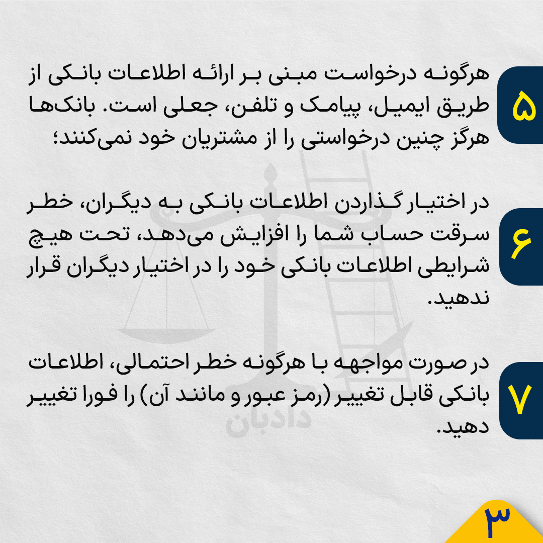 در اختیار گذاردن اطلاعات بانکی به دیگران، خطر سرقت حساب شما را افزایش می‌دهد، تحت هیچ شرایطی اطلاعات بانکی خود را در اختیار دیگران قرار ندهید.