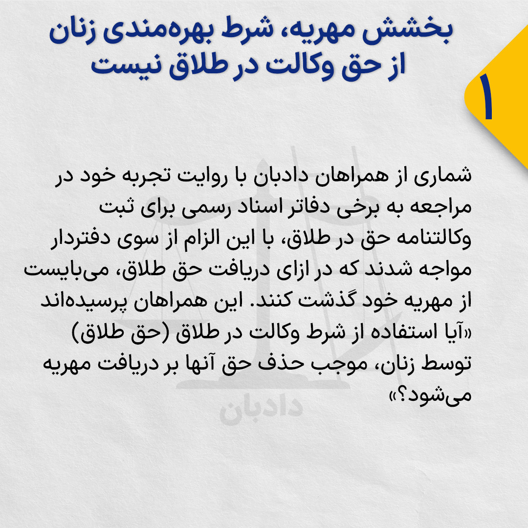 شماری از همراهان دادبان با روایت تجربه خود در مراجعه به برخی دفاتر اسناد رسمی برای ثبت وکالتنامه حق در طلاق، با این الزام از سوی دفتردار مواجه شدند که در ازای دریافت حق طلاق، می‌بایست از مهریه خود گذشت کنند. این همراهان پرسیده‌اند «آیا استفاده از شرط وکالت در طلاق (حق طلاق) توسط زنان، موجب حذف حق آنها بر دریافت مهریه می‌شود؟»