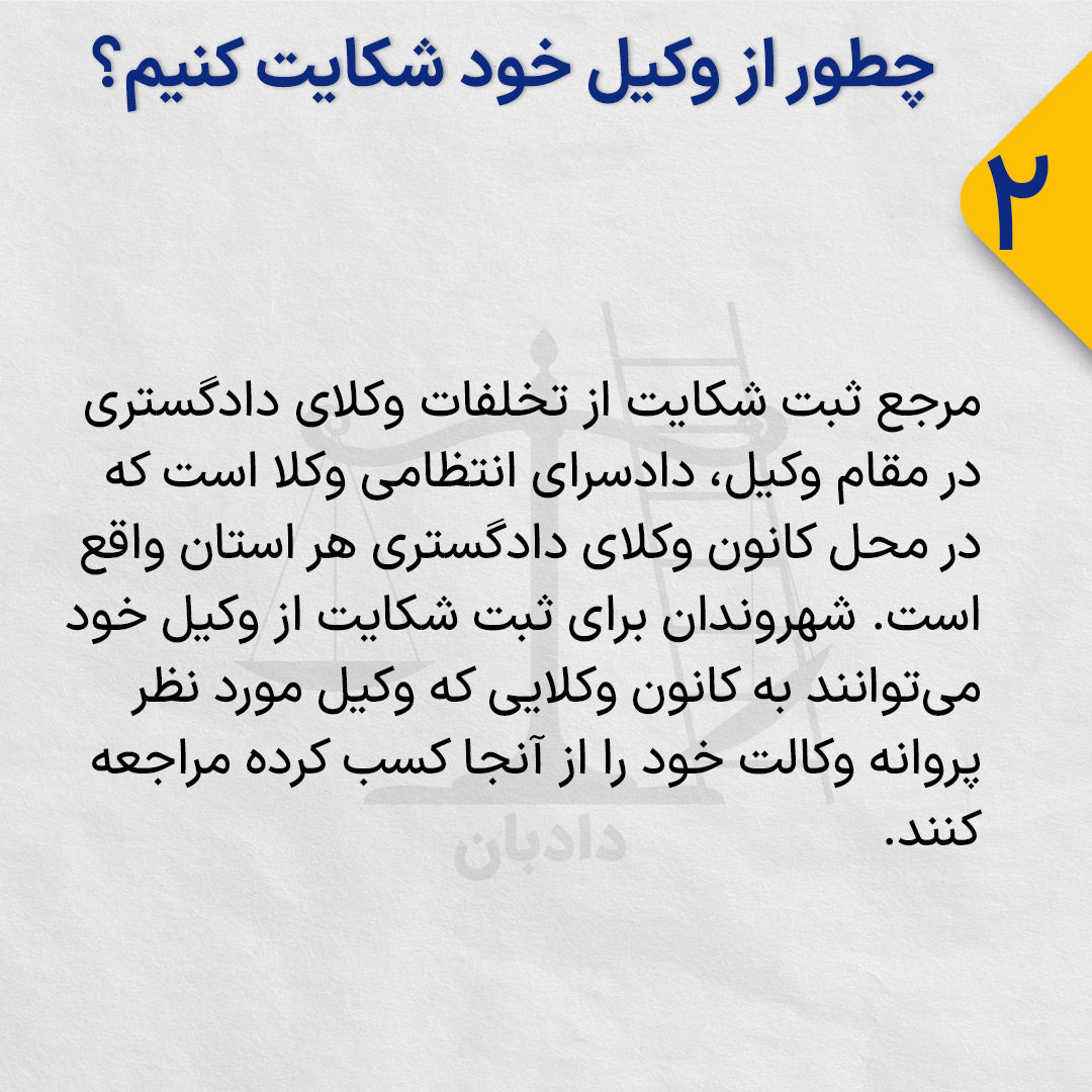 مرجع ثبت شکایت از تخلفات وکلای دادگستری در مقام وکیل، دادسرای انتظامی وکلا است که در محل کانون وکلای دادگستری هر استان واقع است. شهروندان برای ثبت شکایت از وکیل خود میتوانند به کانون وکلایی که وکیل مورد نظر پروانه وکالت خود را از آنجا کسب کرده مراجعه کنند.