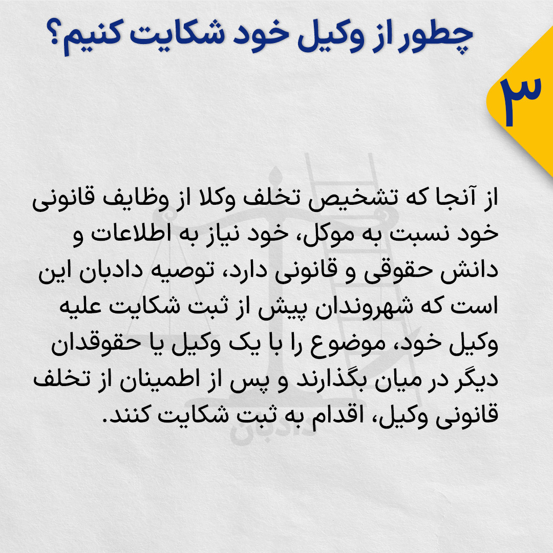 از آنجا که تشخیص تخلف وکلا از وظایف قانونی خود نسبت به موکل، خود نیاز به اطلاعات و دانش حقوقی و قانونی دارد، توصیه دادبان این است که شهروندان پیش از ثبت شکایت علیه وکیل خود، موضوع را با یک وکیل یا حقوقدان دیگر در میان بگذارند و پس از اطمینان از تخلف قانونی وکیل، اقدام به ثبت شکایت کنند.