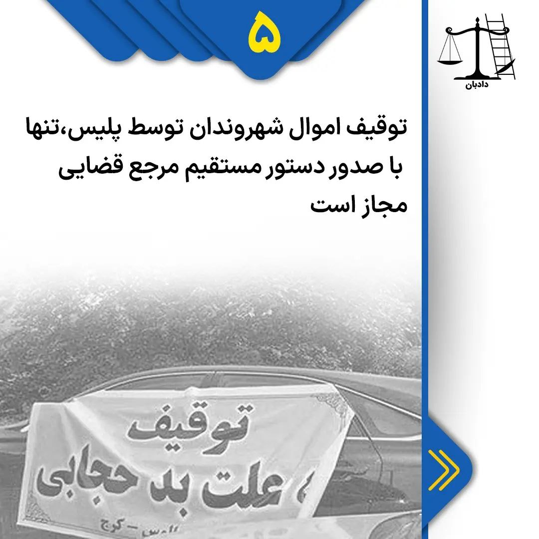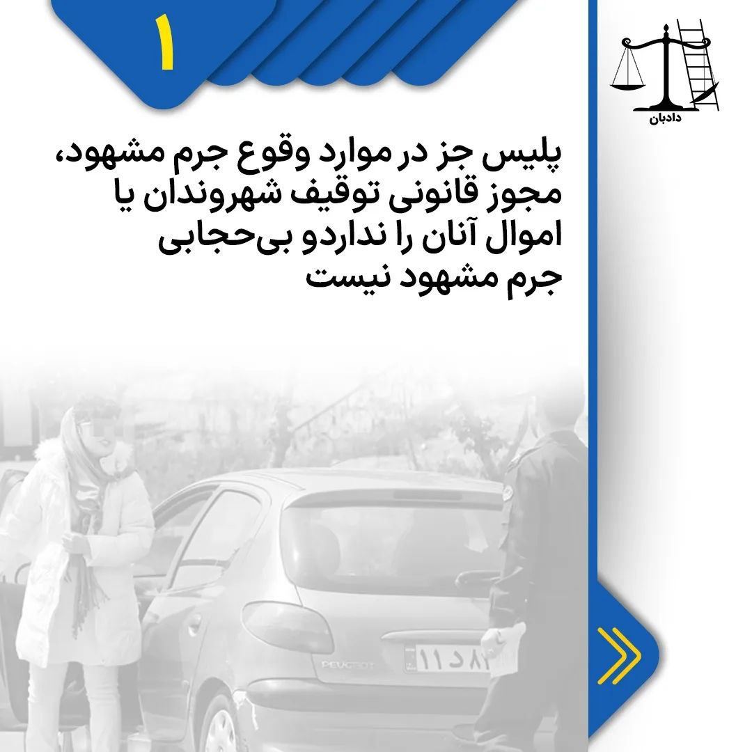– پلیس جز در موارد وقوع جرم مشهود، مجوز قانونی توقیف شهروندان یا اموال آنان را ندارد و بیحجابی جرم مشهود نیست