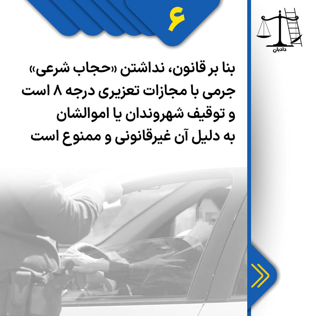 – بنا بر قانون، نداشتن «حجاب شرعی» جرمی با مجازات تعزیری درجه ۸ است و توقیف شهروندان یا اموالشان به دلیل آن غیرقانونی و ممنوع است