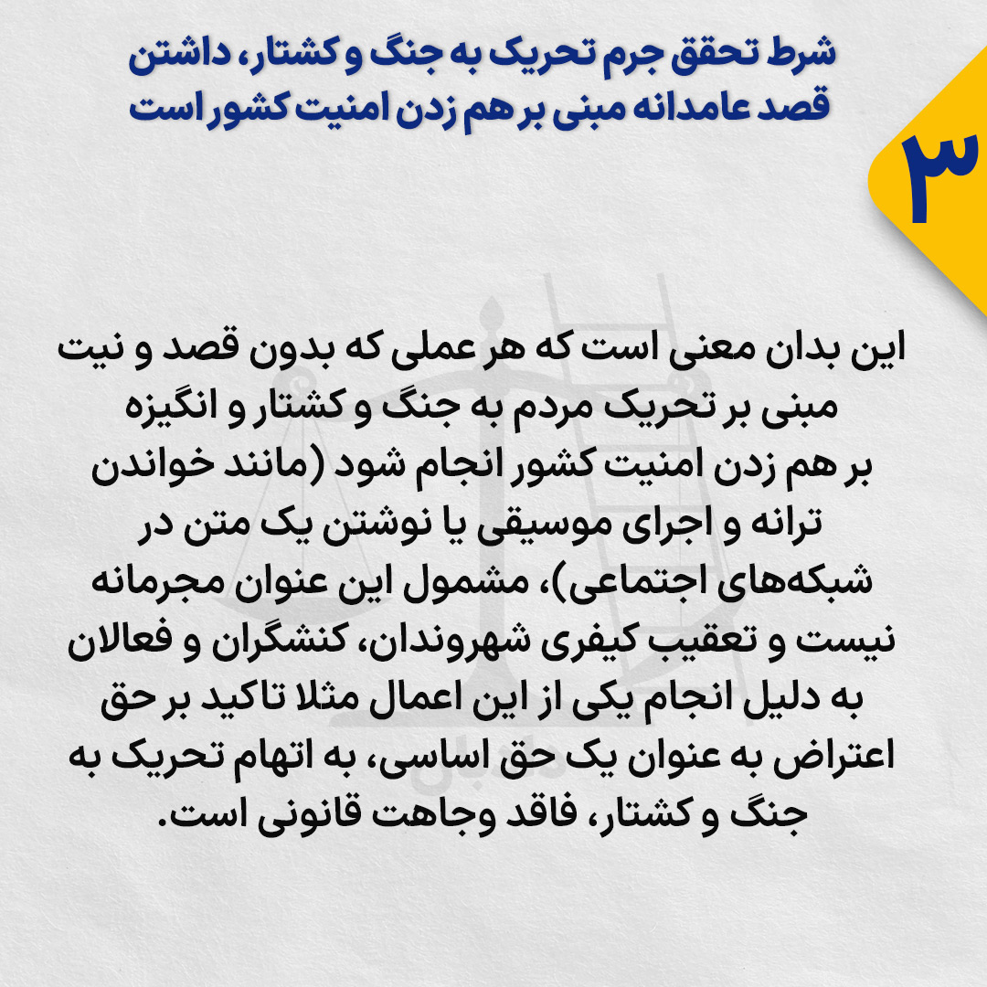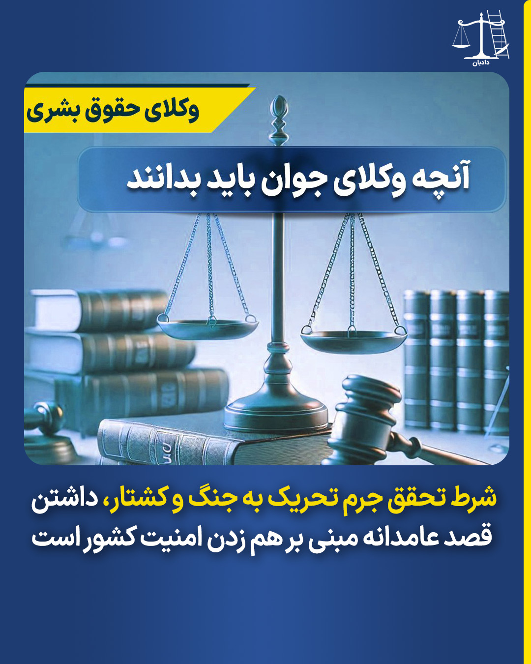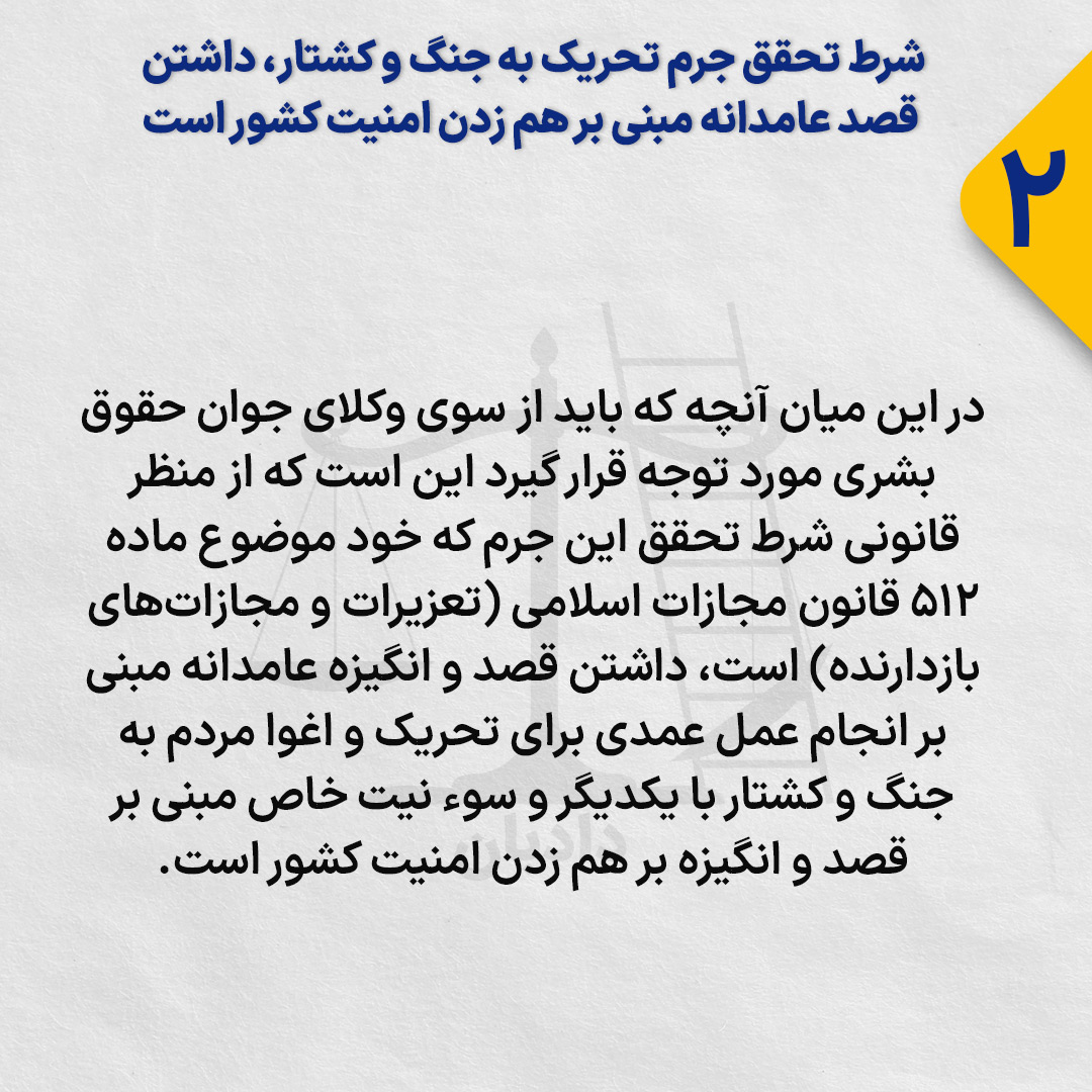 در این میان آنچه که باید از سوی وکلای جوان حقوق بشری مورد توجه قرار گیرد این است که از منظر قانونی شرط تحقق این جرم که خود موضوع ماده ۵۱۲ قانون مجازات اسلامی (تعزیرات و مجازاتهای بازدارنده) است، داشتن قصد و انگیزه عامدانه مبنی بر انجام عمل عمدی برای تحریک و اغوا مردم به جنگ و کشتار با یکدیگر و سوء نیت خاص مبنی بر قصد و انگیزه بر هم زدن امنیت کشور است.