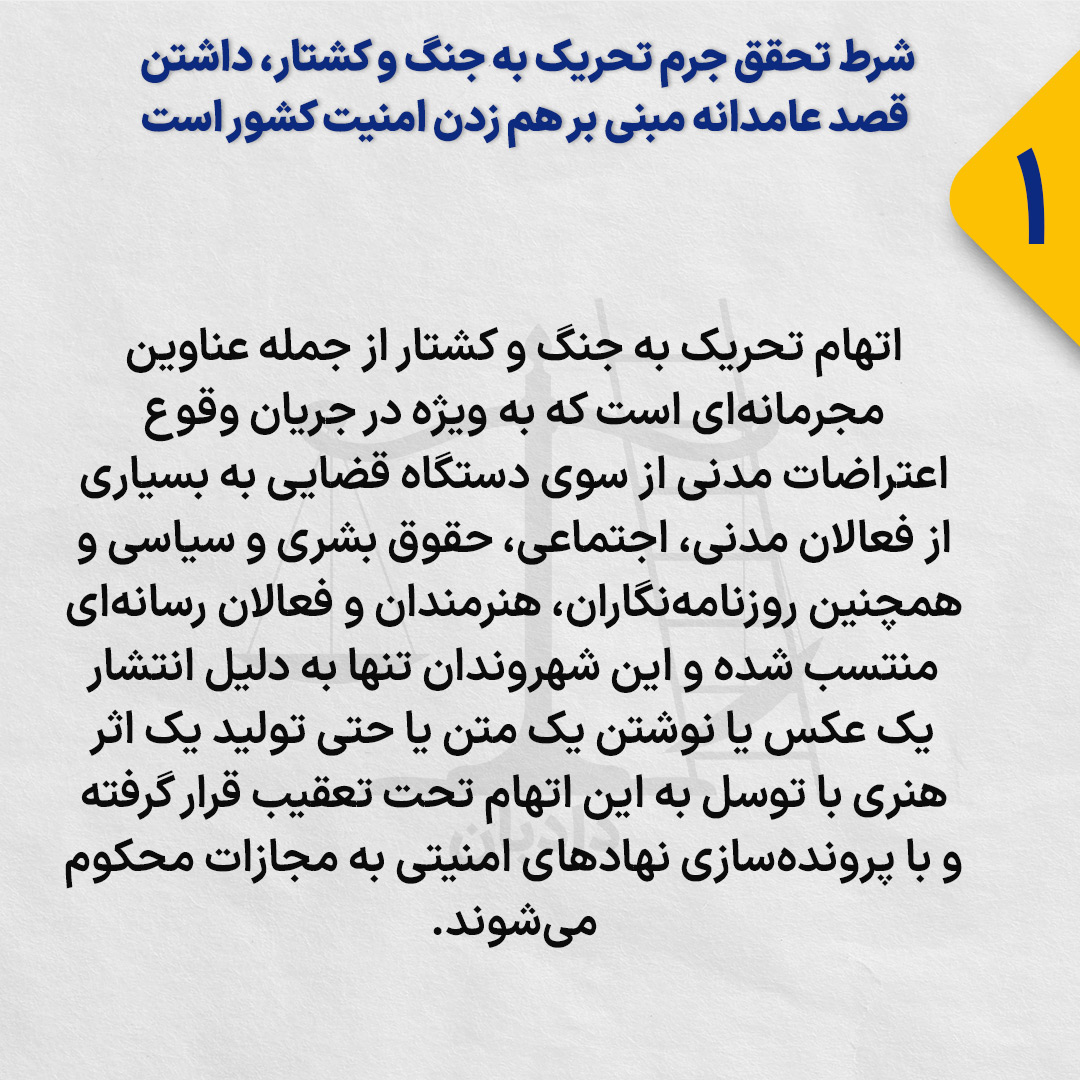 اتهام تحریک به جنگ و کشتار از جمله عناوین مجرمانهای است که به ویژه در جریان وقوع اعتراضات مدنی از سوی دستگاه قضایی به بسیاری از فعالان مدنی، اجتماعی، حقوق بشری و سیاسی و همچنین روزنامهنگاران، هنرمندان و فعالان رسانهای منتسب شده و این شهروندان تنها به دلیل انتشار یک عکس یا نوشتن یک متن یا حتی تولید یک اثر هنری با توسل به این اتهام تحت تعقیب قرار گرفته و با پروندهسازی نهادهای امنیتی به مجازات محکوم میشوند.