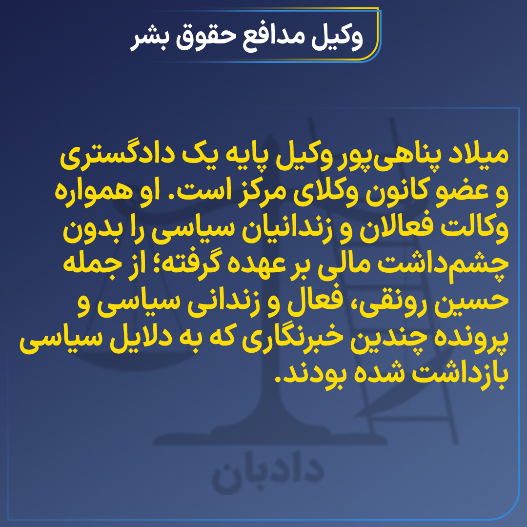 میلاد پناهی‌پور وکیل پایه یک دادگستری و عضو کانون وکلای مرکز است. او همواره وکالت فعالان و زندانیان سیاسی را بدون چشم‌داشت مالی بر عهده گرفته؛ از جمله حسین رونقی، فعال و زندانی سیاسی و پرونده چندین خبرنگاری که به دلایل سیاسی بازداشت شده بودند.