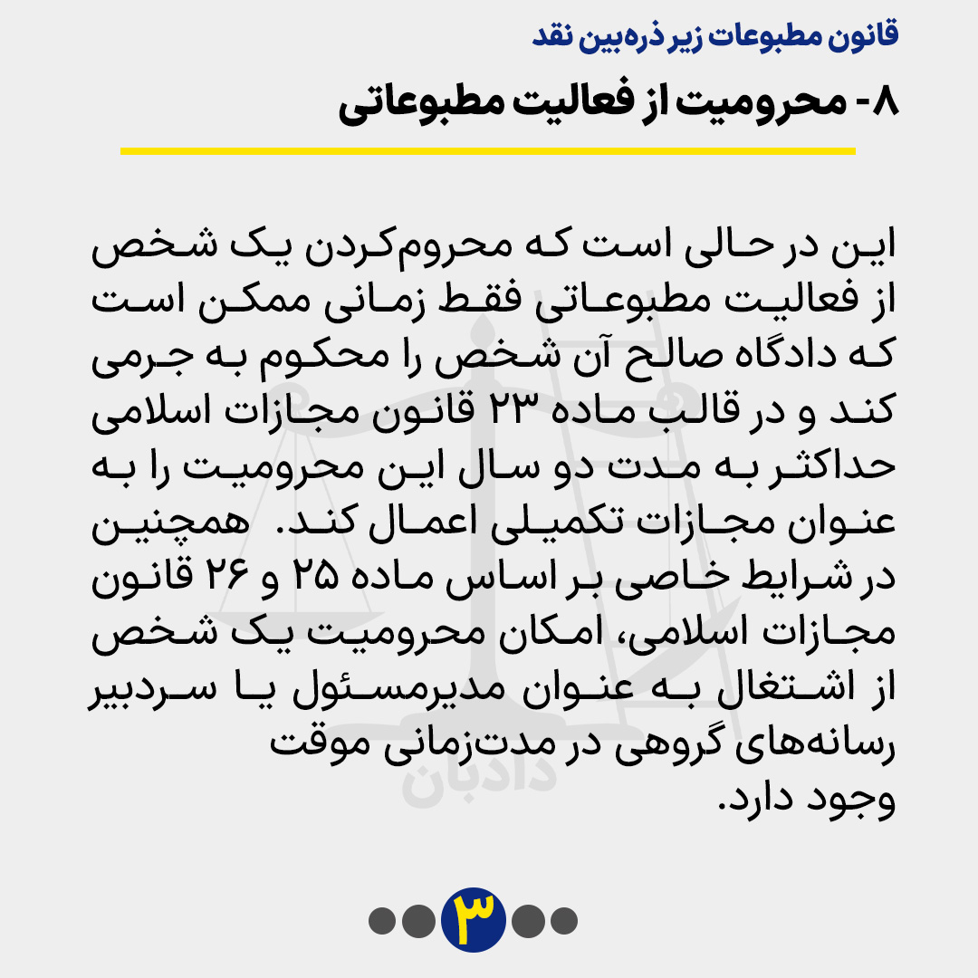 به عبارتی یک شخص فقط در صورت ارتکاب جرم و ثابت‌شدن آن در دادگاه است که در قالب مجازات تکمیلی یا تبعی از اشتغال به فعالیت‌های مطبوعاتی – آن هم برای مدت معین – منع می‌شود. قانون مطبوعات ایران پا را از این فراتر گذاشته و می‌گوید هر کسی که به جرایم امنیتی محکوم شده، به صورت مادام‌العمر از فعالیت مطبوعاتی محروم است. فراتر از این، اگر به جرمی هم مرتکب نشود اما علیه نظام – آن هم به تشخیص هیئت نظارت – تبلیغ کنند، حق فعالیت مطبوعاتی ندارند!!