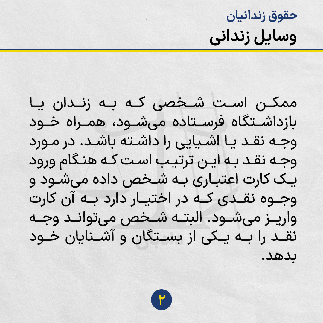 ممکن است شخصی که به زندان یا بازداشتگاه فرستاده میشود، همراه خود وجه نقد یا اشیایی را داشته باشد. در مورد وجه نقد به این ترتیب است که هنگام ورود یک کارت اعتباری به شخص داده میشود و وجوه نقدی که در اختیار دارد به آن کارت واریز میشود. البته شخص میتواند وجه نقد را به یکی از بستگان و آشنایان خود بدهد.