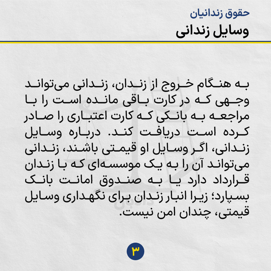 به هنگام خروج از زندان، زندانی میتواند وجهی که در کارت باقی مانده است را با مراجعه به بانکی که کارت اعتباری را صادر کرده است دریافت کند. درباره وسایل زندانی، اگر وسایل او قیمتی باشند، زندانی میتواند آن را به یک موسسهای که با زندان قرارداد دارد یا به صندوق امانت بانک بسپارد؛ زیرا انبار زندان برای نگهداری وسایل قیمتی، چندان امن نیست.