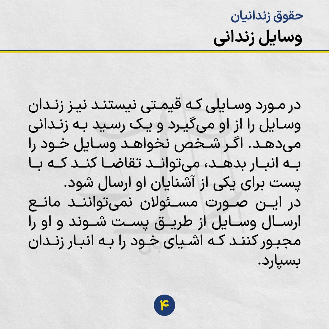 در مورد وسایلی که قیمتی نیستند نیز زندان وسایل را از او میگیرد و یک رسید به زندانی میدهد. اگر شخص نخواهد وسایل خود را به انبار بدهد، میتواند تقاضا کند که با پست برای یکی از آشنایان او ارسال شود. در این صورت مسئولان نمیتوانند مانع ارسال وسایل از طریق پست شوند و او را مجبور کنند که اشیای خود را به انبار زندان بسپارد