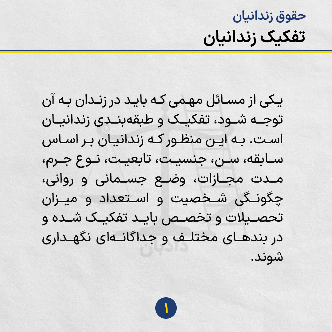یکی از مسائل مهمی که باید در زندان به آن توجه شود، تفکیک و طبقهبندی زندانیان است. به این منظور که زندانیان بر اساس سابقه، سن، جنسیت، تابعیت، نوع جرم، مدت مجازات، وضع جسمانی و روانی، چگونگی شخصیت و استعداد و میزان تحصیلات و تخصص باید تفکیک شده و در بندهای مختلف و جداگانهای نگهداری شوند.