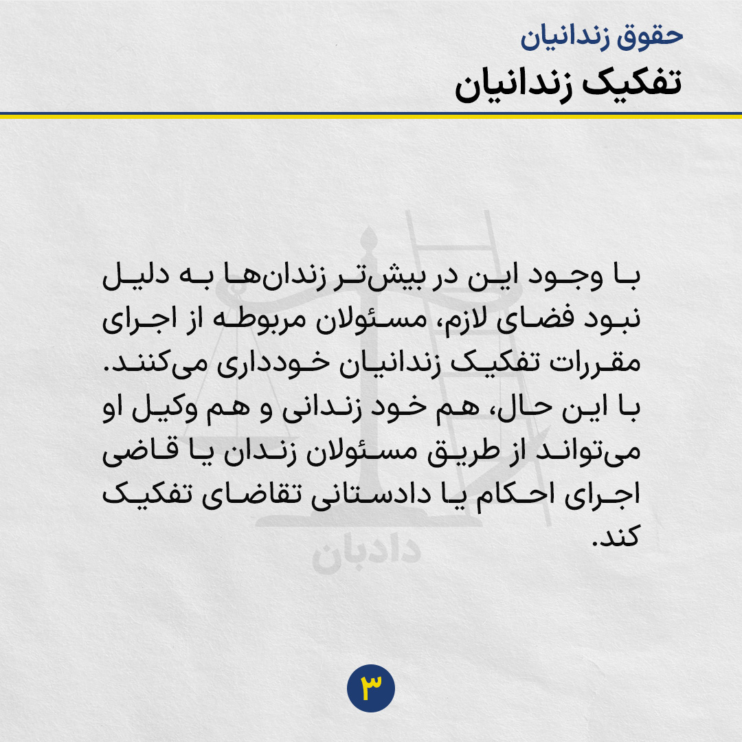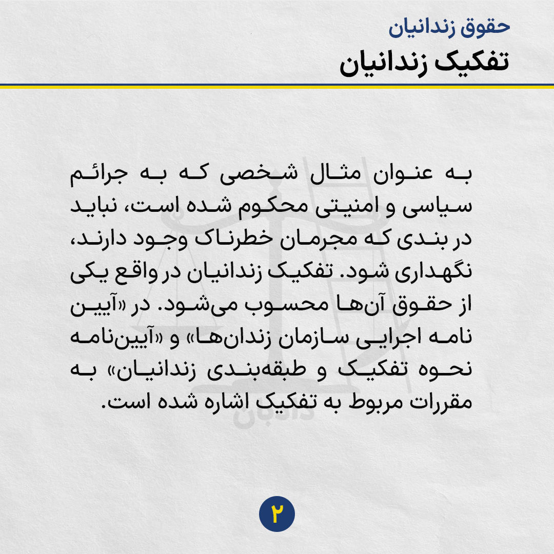 به عنوان مثال شخصی که به جرائم سیاسی و امنیتی محکوم شده است، نباید در بندی که مجرمان خطرناک وجود دارند، نگهداری شود. تفکیک زندانیان در واقع یکی از حقوق آنها محسوب میشود. در «آییننامه اجرایی سازمان زندانها» و «آییننامه نحوه تفکیک و طبقهبندی زندانیان» به مقررات مربوط به تفکیک اشاره شده است.