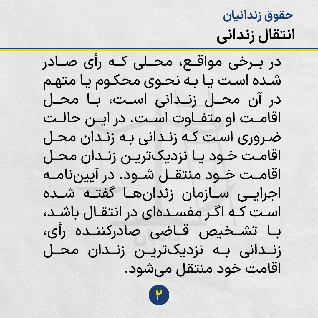 در برخی مواقع، محلی که رأی صادر شده است یا به نحوی محکوم یا متهم در آن محل زندانی است، با محل اقامت او متفاوت است. در این حالت ضروری است که زندانی به زندان محل اقامت خود یا نزدیکترین زندان محل اقامت خود منتقل شود. در آییننامه اجرایی سازمان زندانها گفته شده است که اگر مفسدهای در انتقال باشد، با تشخیص قاضی صادرکننده رأی، زندانی به نزدیکترین زندان محل اقامت خود منتقل میشود.