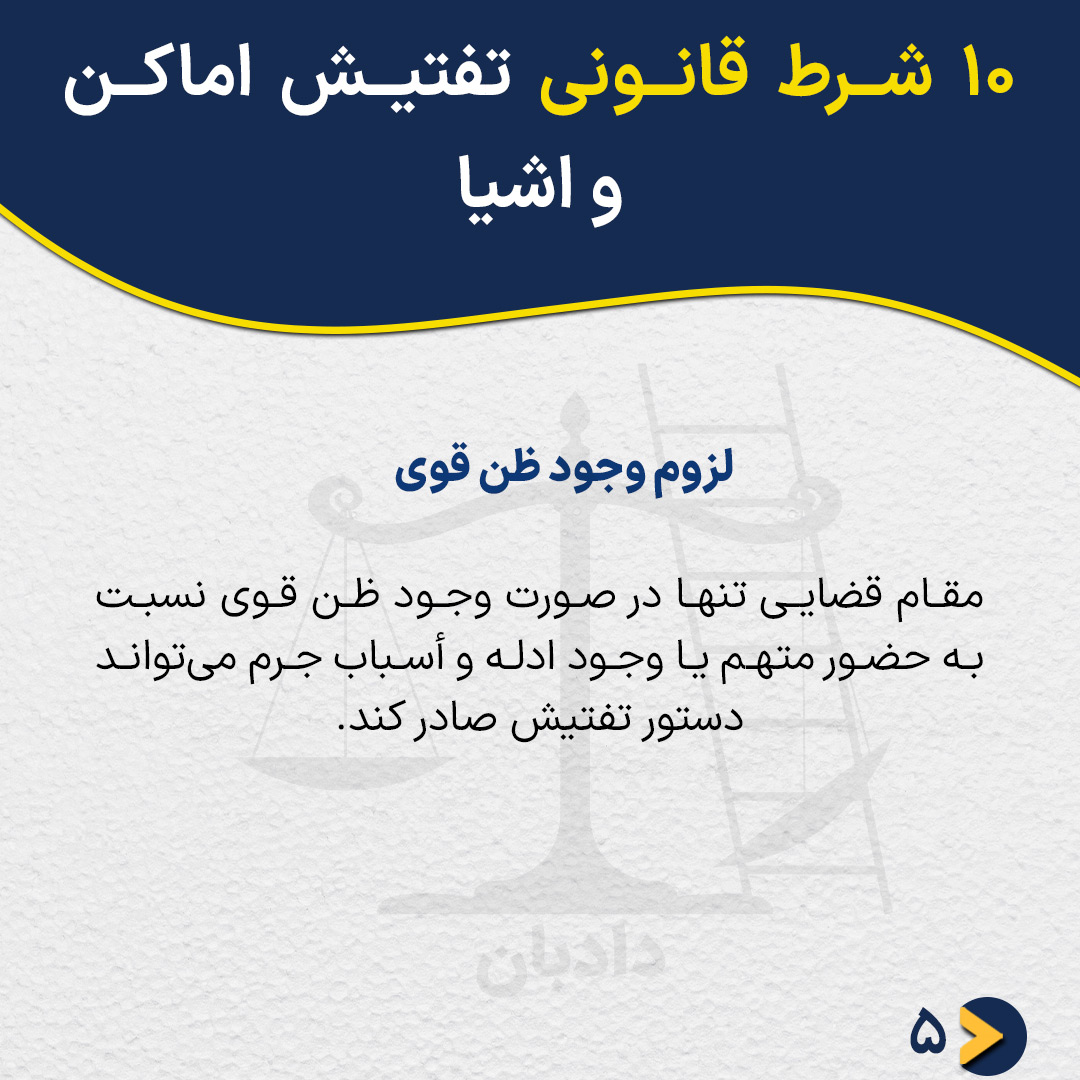مقام قضایی تنها در صورت وجود ظن قوی نسبت به حضور متهم یا وجود ادله و أسباب جرم میتواند دستور تفتیش صادر کند.