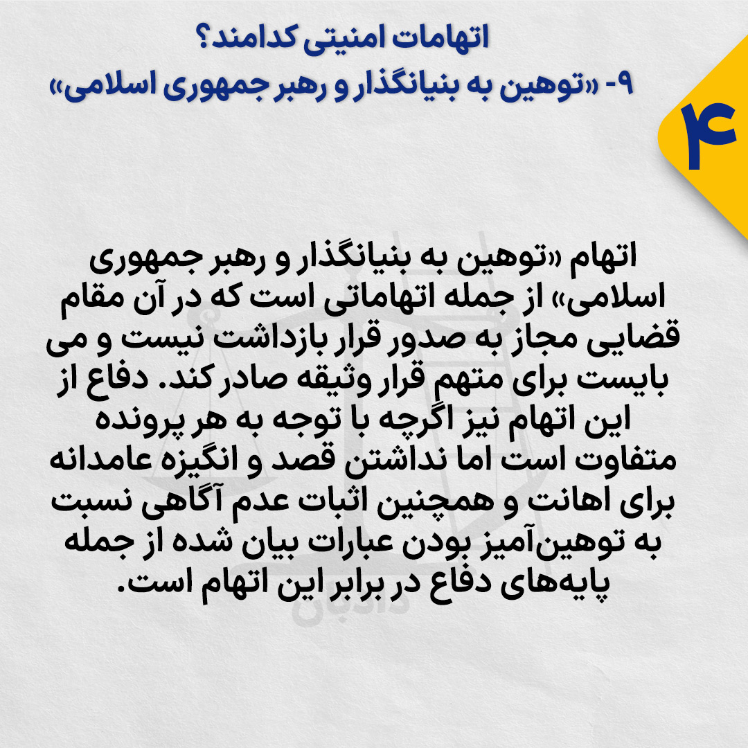 اگرچه اتهام «توهین به بنیانگذار و رهبر جمهوری اسلامی» قانونا زیر مجموعه فصل اول کتاب پنجم قانون مجازات اسلامی نیست و نباید به عنوان یک اتهام امنیتی در نظر گرفته شود، اما متاسفانه در عمل دادسراها و دادگاه‌های انقلاب در اقدامی غیر قانونی با متهمان این اتهام، به مانند متهمان اتهامات امنیتی برخورد می‌کنند.