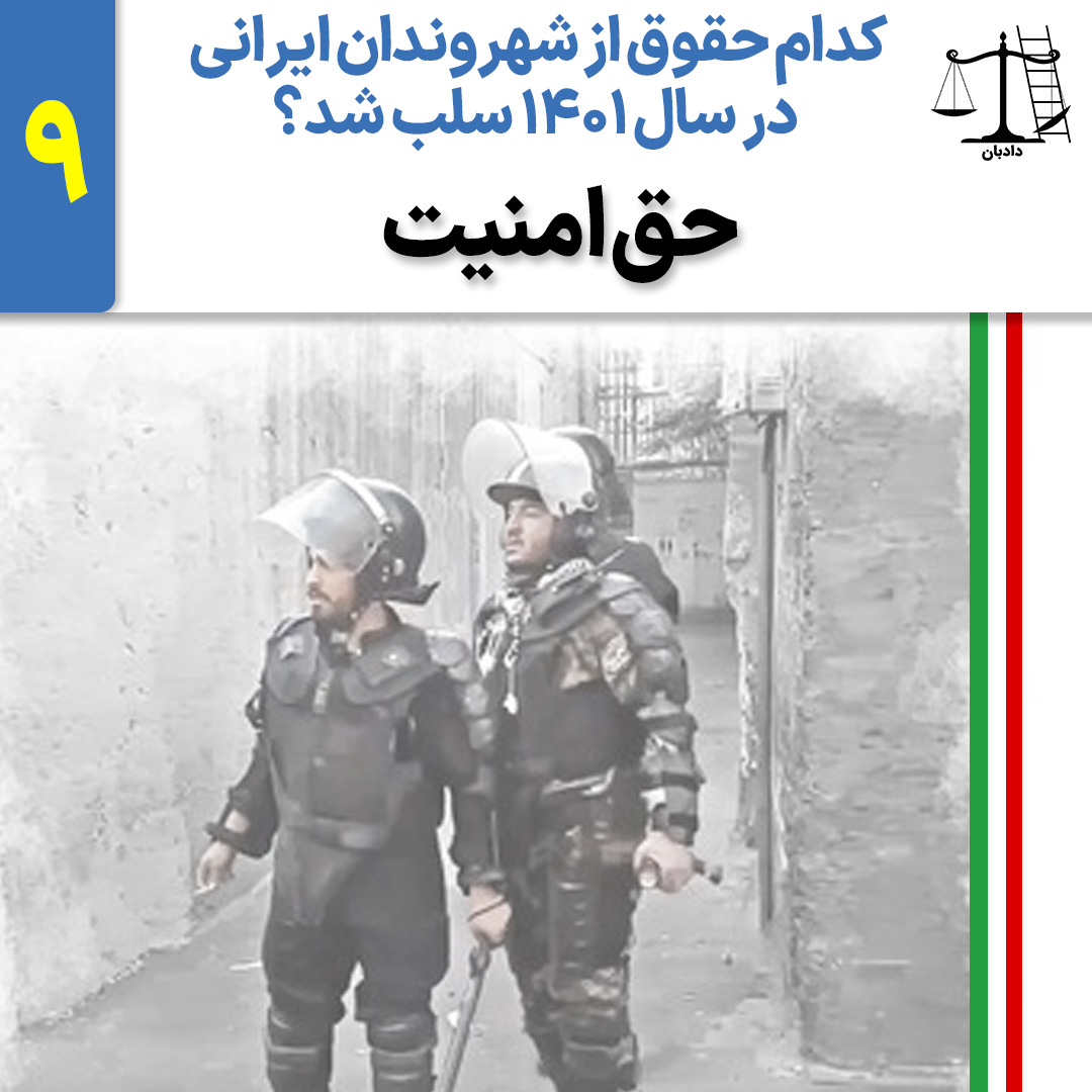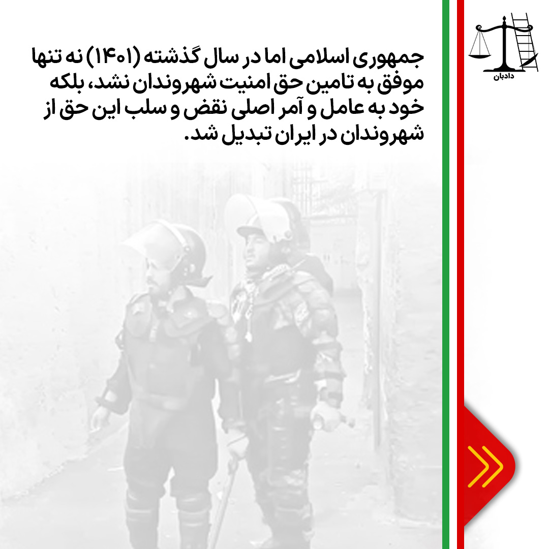 نظام جمهوری اسلامی اما در سال گذشته (۱۴۰۱) نه تنها موفق به تامین حق امنیت شهروندان نشد بلکه خود به عامل و آمر اصلی نقض و سلب این حق از شهروندان در ایران تبدیل شد.