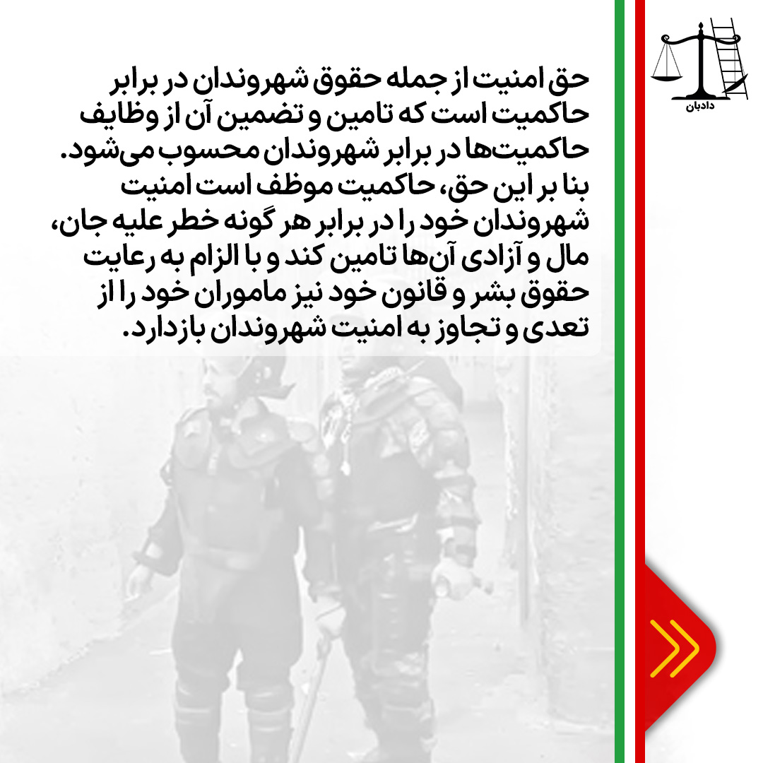 حق امنیت از جمله حقوق شهروندان در برابر حاکمیت است و تامین و تضمین آن از وظایف حاکمیتها در برابر شهروندان محسوب میشود. بنا بر این حق حاکمیت موظف است امنیت شهروندان خود را در برابر هرگونه خظر علیه جان و مال و آزادی تامین کرده و با الزام به رعایت حقوق بشر و قانون خود نیز ماموران خود را از تعدی و تجاوز به امنیت شهروندان بازدارد.