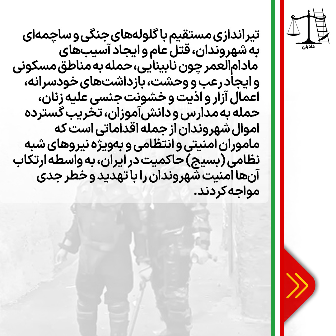 تیراندازی مستقیم با گلولههای جنگی و ساچمهای به شهروندان غیر نظامی و غیر مسلح و قتل عام و ایجاد آسیبهای مادامالعمر مانند نابینایی، حمله به مناطق مسکونی و ایجاد رعب و وحشت، بازداشتهای خودسرانه، اعمال آزار و اذیت و خشونت جنسی علیه زنان، حمله به مدارس و دانشآموزان، تخریب گسترده اموال شهروندان و ورود غیر قانونی همراه با زور به منازل شهروندان از جمله اقداماتی است که ماموران امنیتی و انتظامی و بهویژه نیروهای شبهنظامی (بسیج) حاکمیت در ایران به واسطه ارتکاب آنها امنیت شهروندان را با تهدید و خطر جدی مواجه کردند.