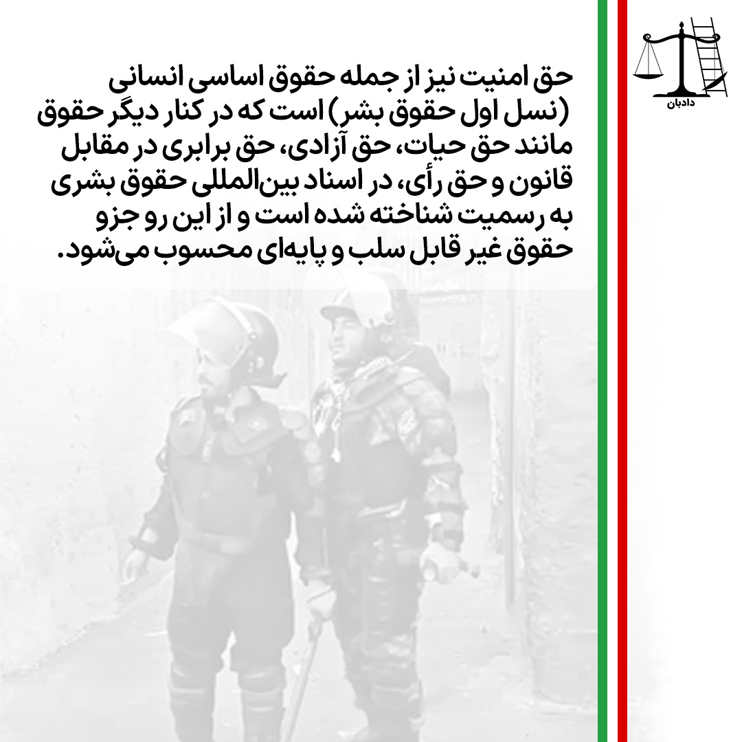 حق امنیت نیز از جمله حقوق اساسی انسانی (نسل اول حقوق بشر) است که در کنار دیگر حقوق مانند حق حیات، حق آزادی، حق برابری در مقابل قانون و حق رأی در اسناد بینالمللی حقوق بشری به رسمیت شناخته شده است و از این رو جزو حقوق غیر قابل سلب و پایهای محسوب میشود.