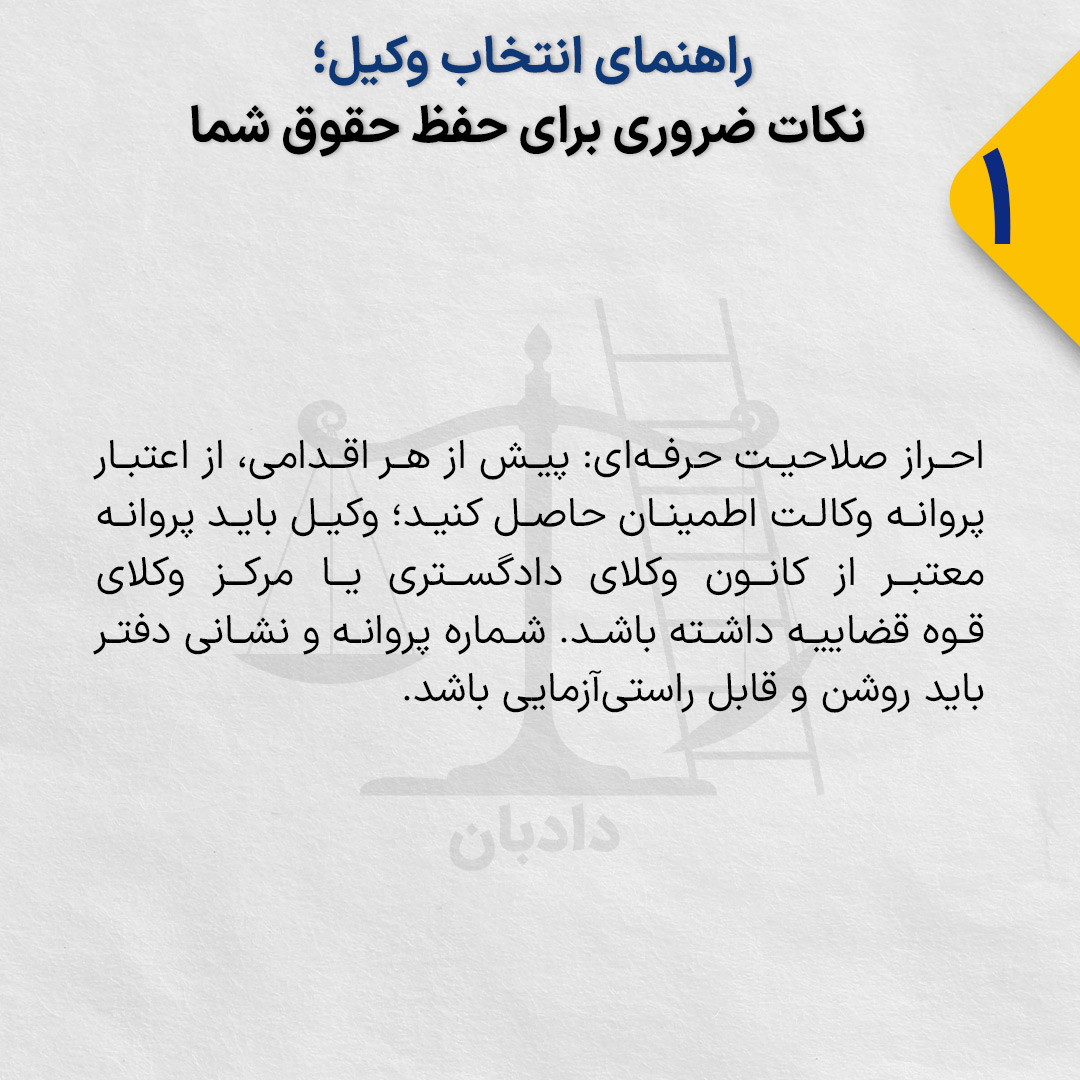احراز صلاحیت حرفهای: پیش از هر اقدامی، از اعتبار پروانه وکالت اطمینان حاصل کنید؛ وکیل باید پروانه معتبر از کانون وکلای دادگستری یا مرکز وکلای قوه قضاییه داشته باشد. شماره پروانه و نشانی دفتر باید روشن و قابل راستیآزمایی باشد.