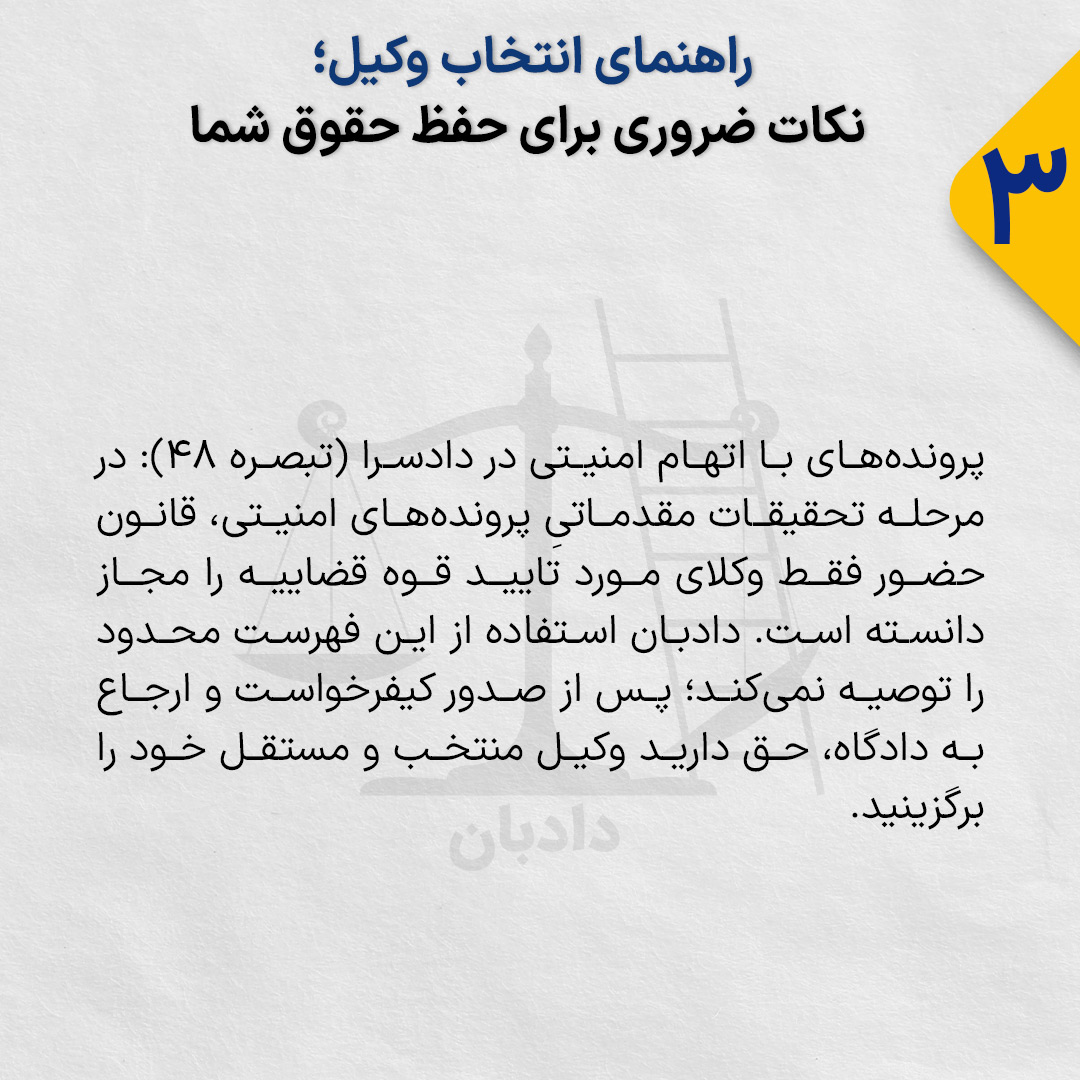 پروندههای با اتهام امنیتی در دادسرا (تبصره ۴۸): در مرحله تحقیقات مقدماتیِ پروندههای امنیتی، قانون حضور فقط وکلای مورد تایید قوه قضاییه را مجاز دانسته است. دادبان استفاده از این فهرست محدود را توصیه نمیکند؛ پس از صدور کیفرخواست و ارجاع به دادگاه، حق دارید وکیل منتخب و مستقل خود را برگزینید.
