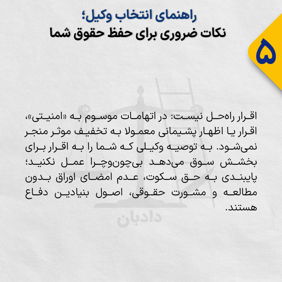 اقرار راهحل نیست: در اتهامات موسوم به «امنیتی»، اقرار یا اظهار پشیمانی معمولا به تخفیف موثر منجر نمیشود. به توصیه وکیلی که شما را به اقرار برای بخشش سوق میدهد بیچونوچرا عمل نکنید؛ پایبندی به حق سکوت، عدم امضای اوراق بدون مطالعه و مشورت حقوقی، اصول بنیادین دفاع هستند.