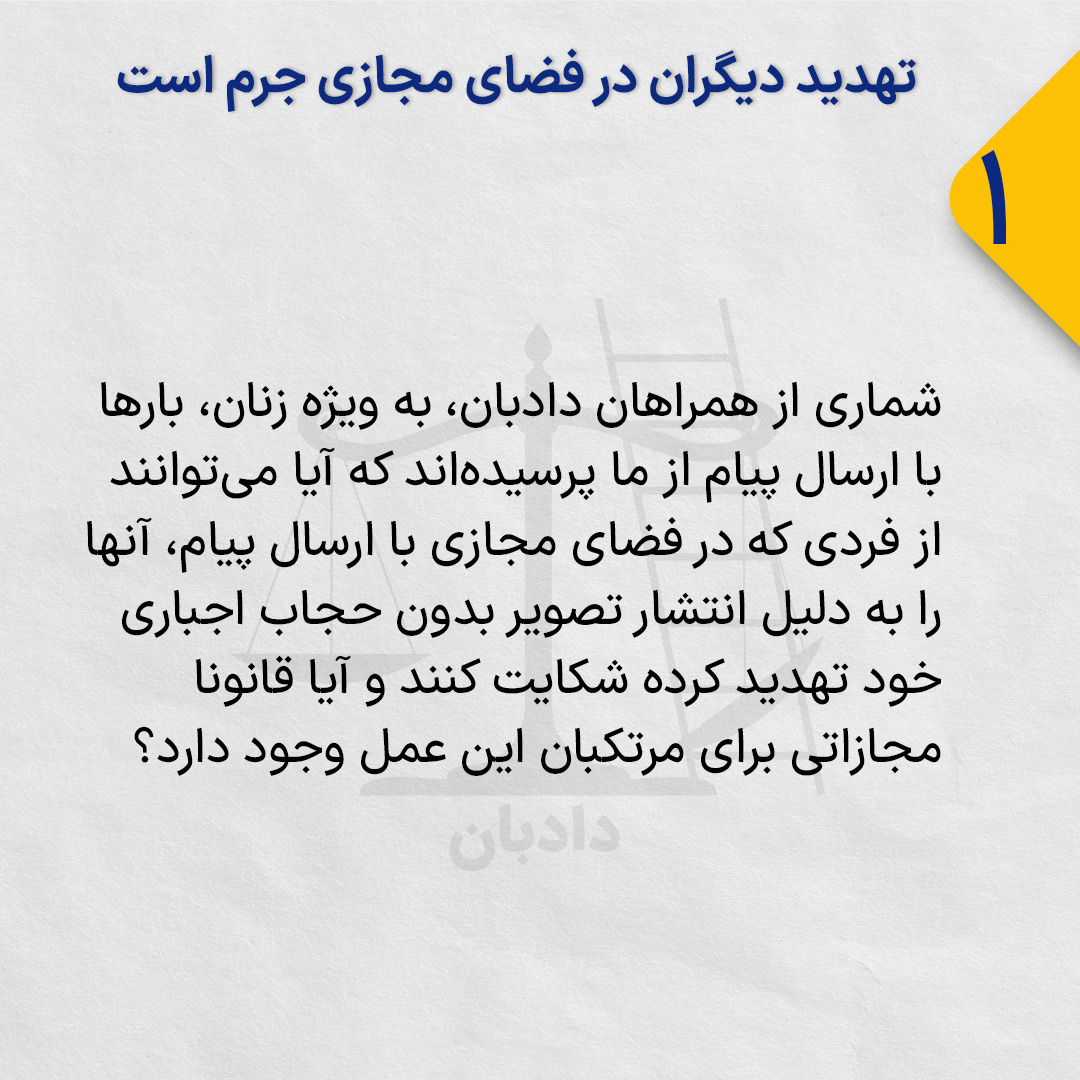 شماری از همراهان دادبان، به ویژه زنان، بارها با ارسال پیام از ما پرسیده‌اند که آیا می‌توانند از فردی که در فضای مجازی با ارسال پیام، آنها را به دلیل انتشار تصویر بدون حجاب اجباری خود تهدید کرده شکایت کنند و آیا قانونا مجازاتی برای مرتکبان این عمل وجود دارد؟