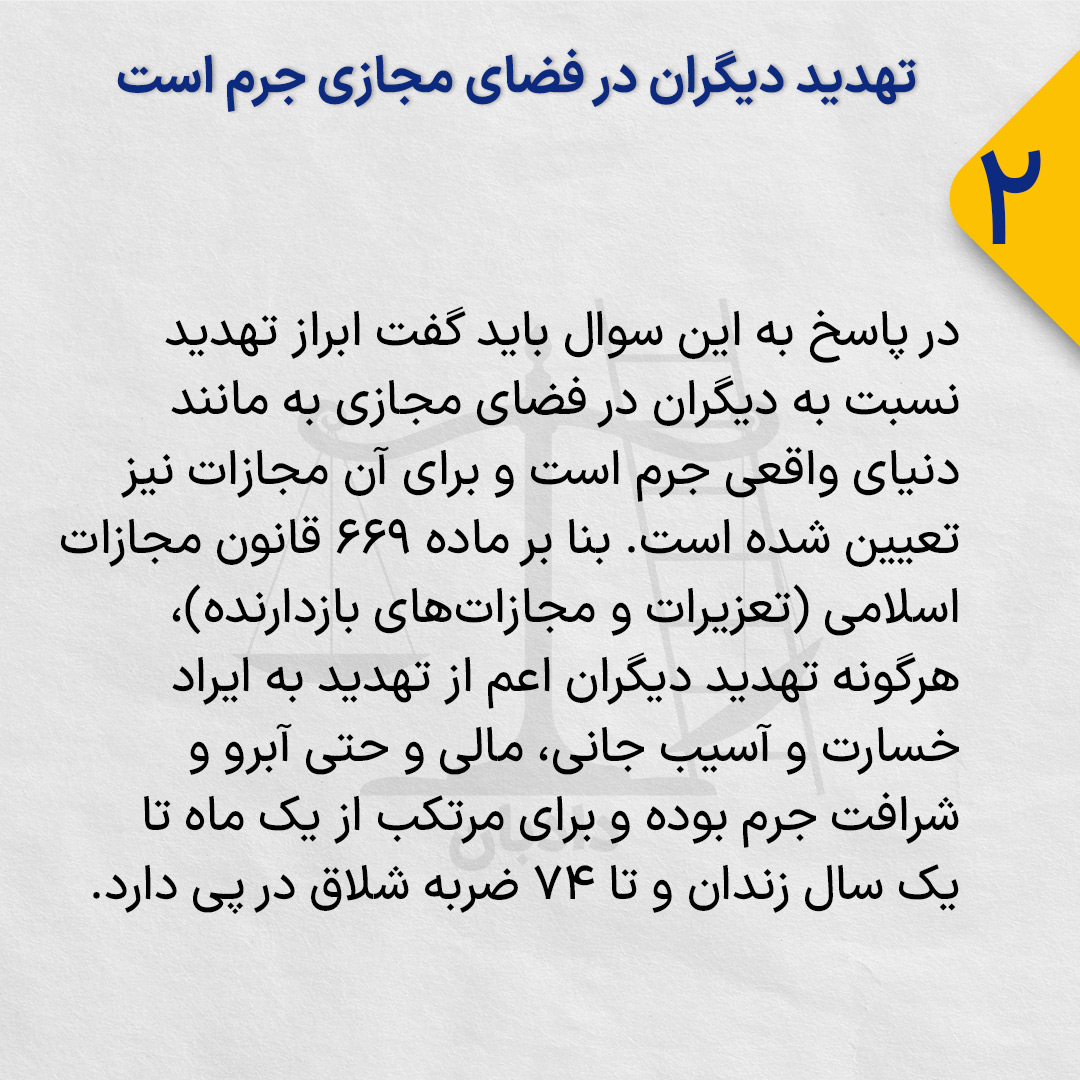 در پاسخ به این سوال باید گفت ابراز تهدید نسبت به دیگران در فضای مجازی به مانند دنیای واقعی جرم است و برای آن مجازات نیز تعیین شده است. بنا بر ماده ۶۶۹ قانون مجازات اسلامی (تعزیرات و مجازات‌های بازدارنده)، هرگونه تهدید دیگران اعم از تهدید به ایراد خسارت و آسیب جانی، مالی و حتی آبرو و شرافت جرم بوده و برای مرتکب از یک ماه تا یک سال زندان و تا ۷۴ ضربه شلاق در پی دارد.