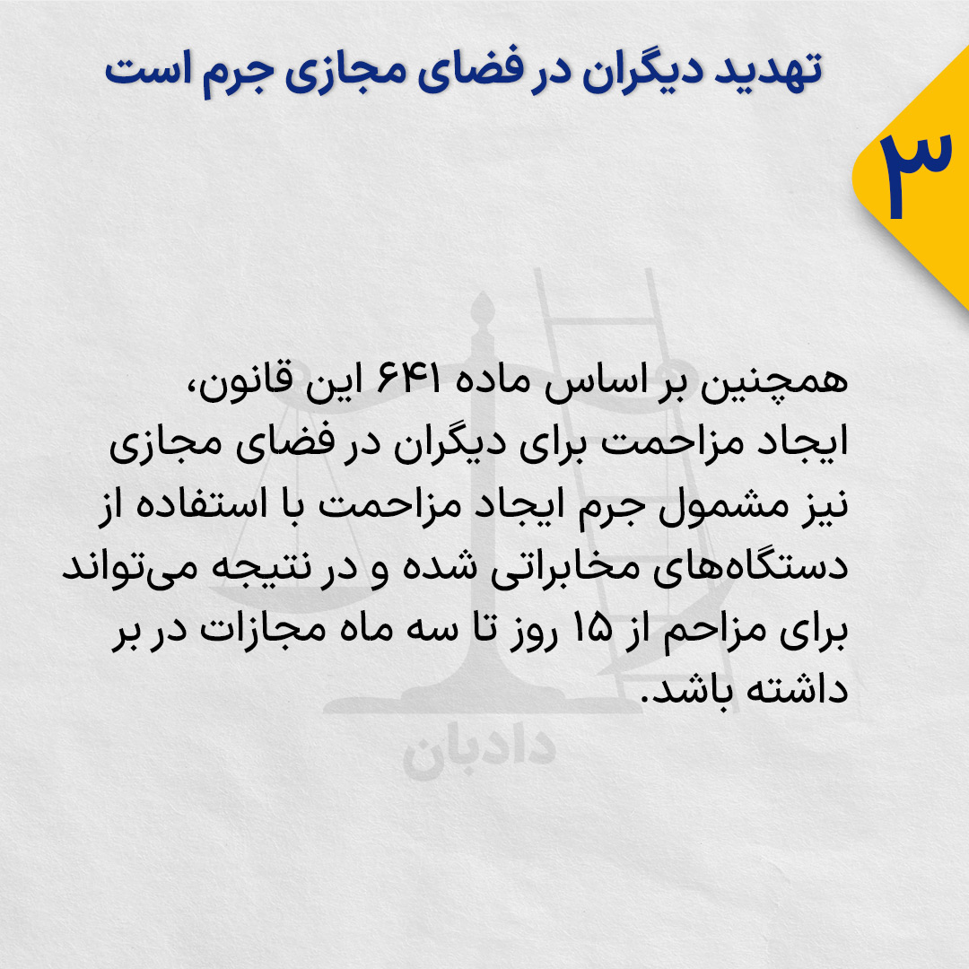همچنین بر اساس ماده ۶۴۱ این قانون، ایجاد مزاحمت برای دیگران در فضای مجازی نیز مشمول جرم ایجاد مزاحمت با استفاده از دستگاه‌های مخابراتی شده و در نتیجه می‌تواند برای مزاحم از ۱۵ روز تا سه ماه مجازات در بر داشته باشد.