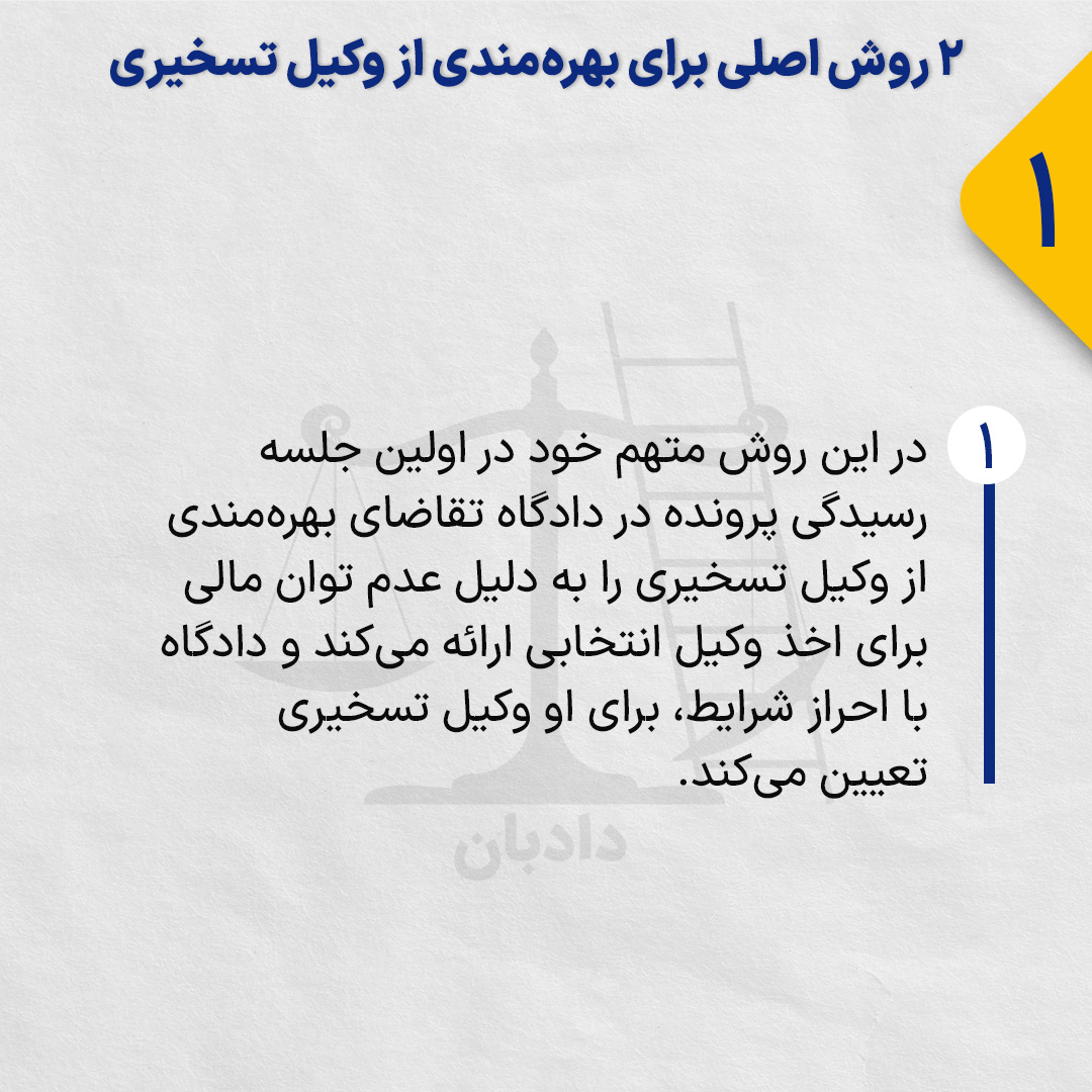 ۱_ در این روش متهم خود در اولین جلسه رسیدگی پرونده در دادگاه تقاضای بهرهمندی از وکیل تسخیری را به دلیل عدم توان مالی برای اخذ وکیل انتخابی ارائه میکند و دادگاه با احراز شرایط، برای او وکیل تسخیری تعیین میکند.