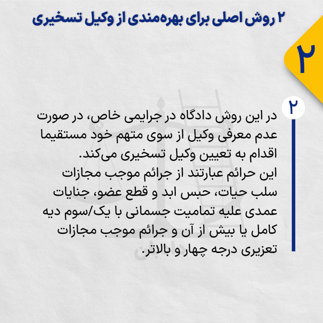 ۲_ در این روش دادگاه در جرایمی خاص، در صورت عدم معرفی وکیل از سوی متهم خود مستقیما اقدام به تعیین وکیل تسخیری میکند.