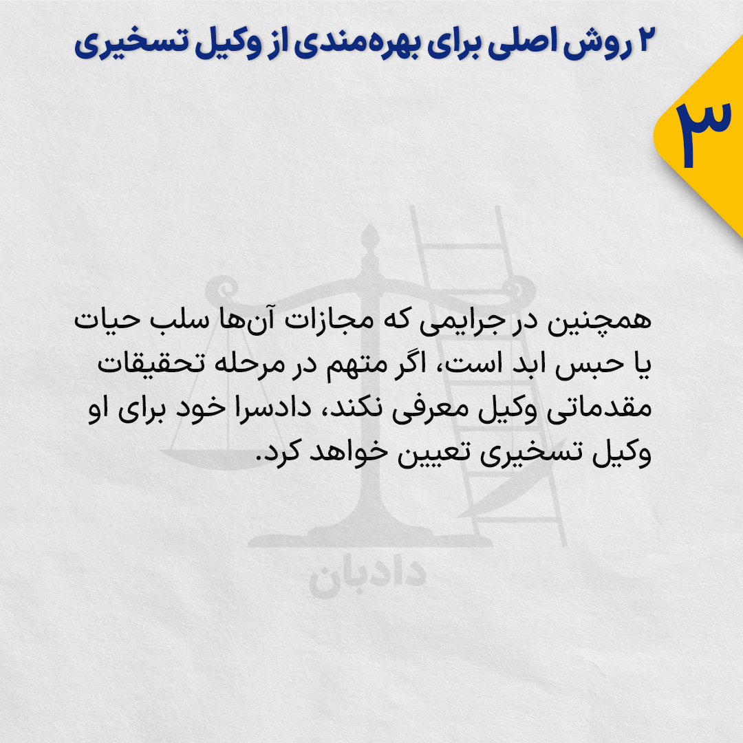 همچنین در جرایمی که مجازات آنها سلب حیات یا حبس ابد است، اگر متهم در مرحله تحقیقات مقدماتی وکیل معرفی نکند، دادسرا خود برای او وکیل تسخیری تعیین خواهد کرد.