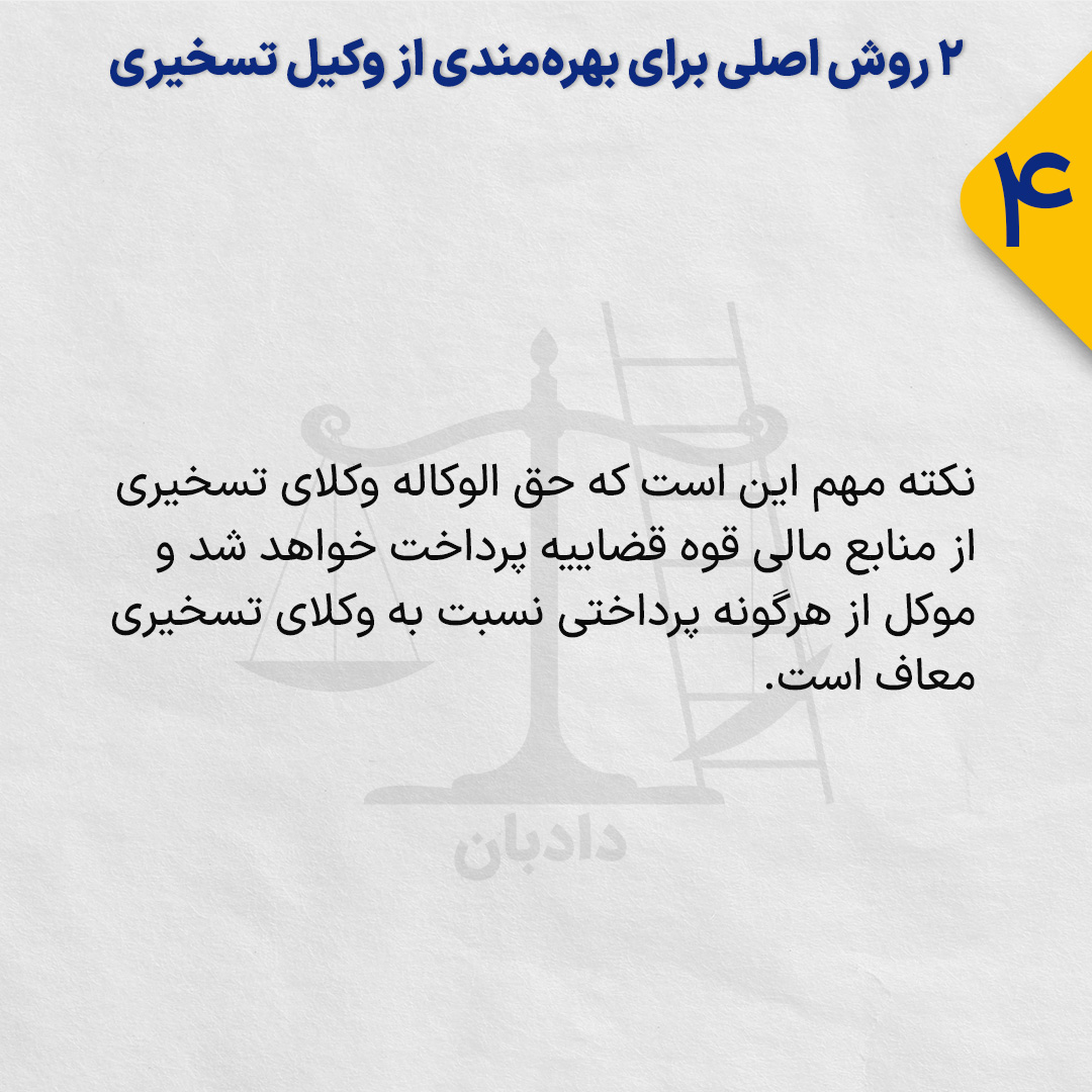نکته مهم این است که حق الوکاله وکلای تسخیری از منابع مالی قوه قضاییه پرداخت خواهد شد و موکل از هرگونه پرداختی نسبت به وکلای تسخیری معاف است.