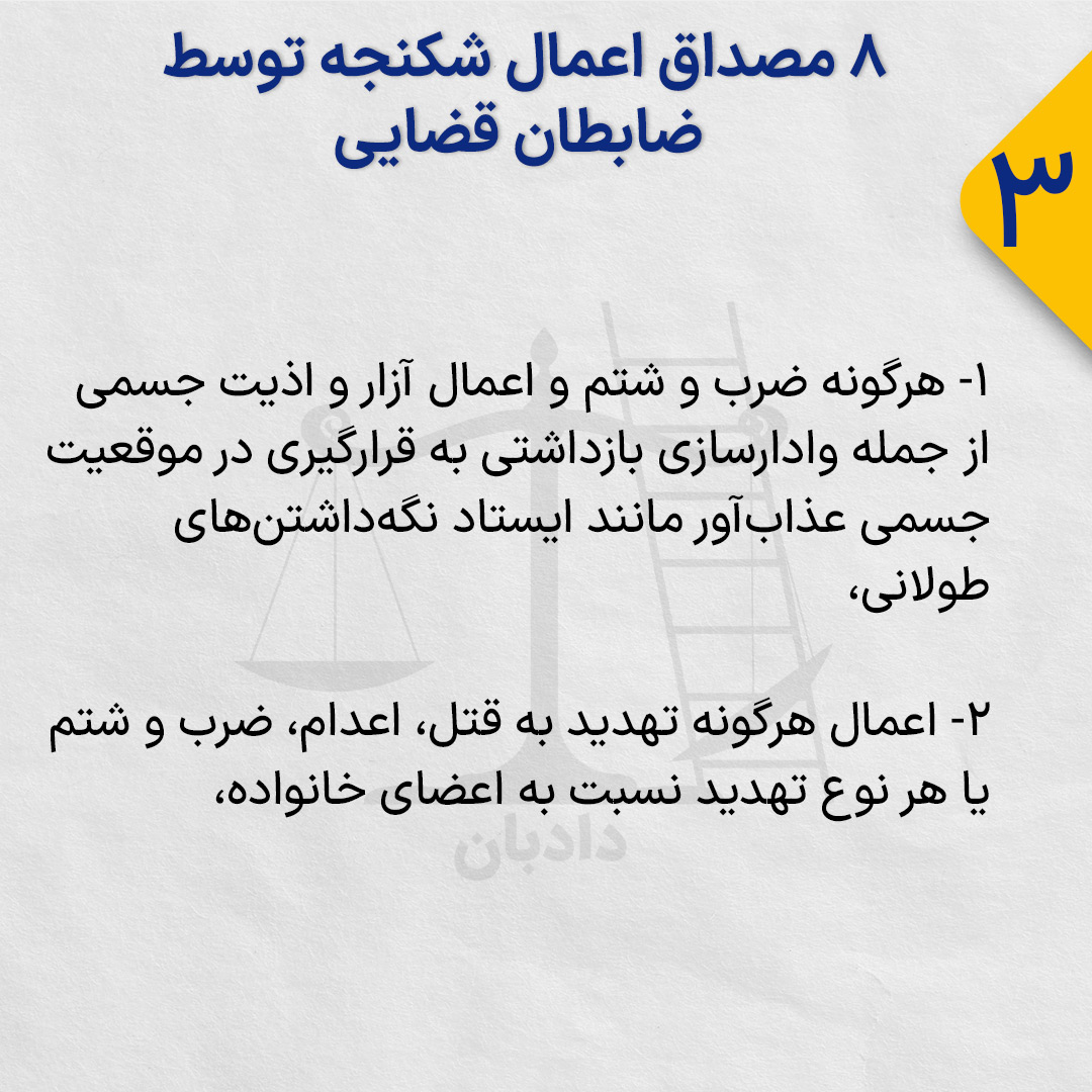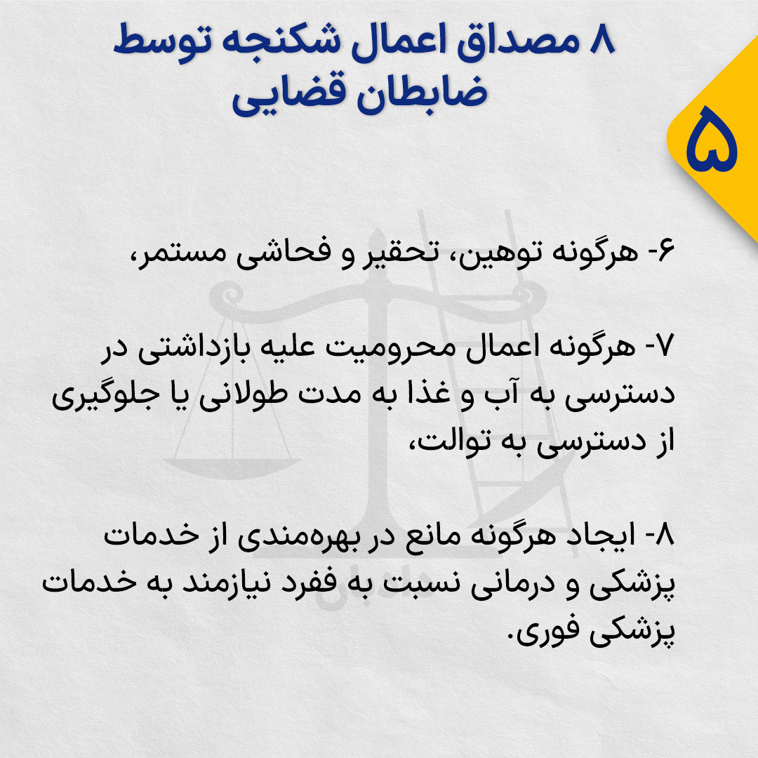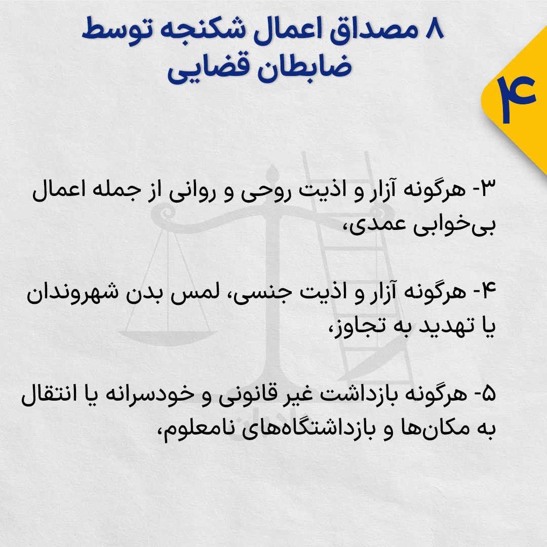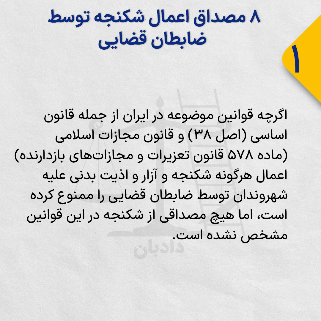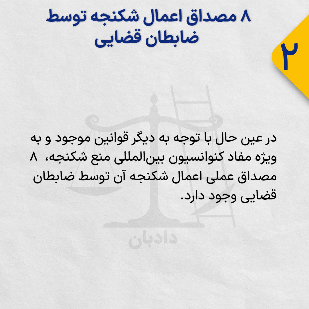 در عین حال با توجه به دیگر قوانین موجود و بهویژه مفاد کنوانسیون بینالمللی منع شکنجه، ۸ مصداق عملی اعمال شکنجه آن توسط ضابطان قضایی وجود دارد.