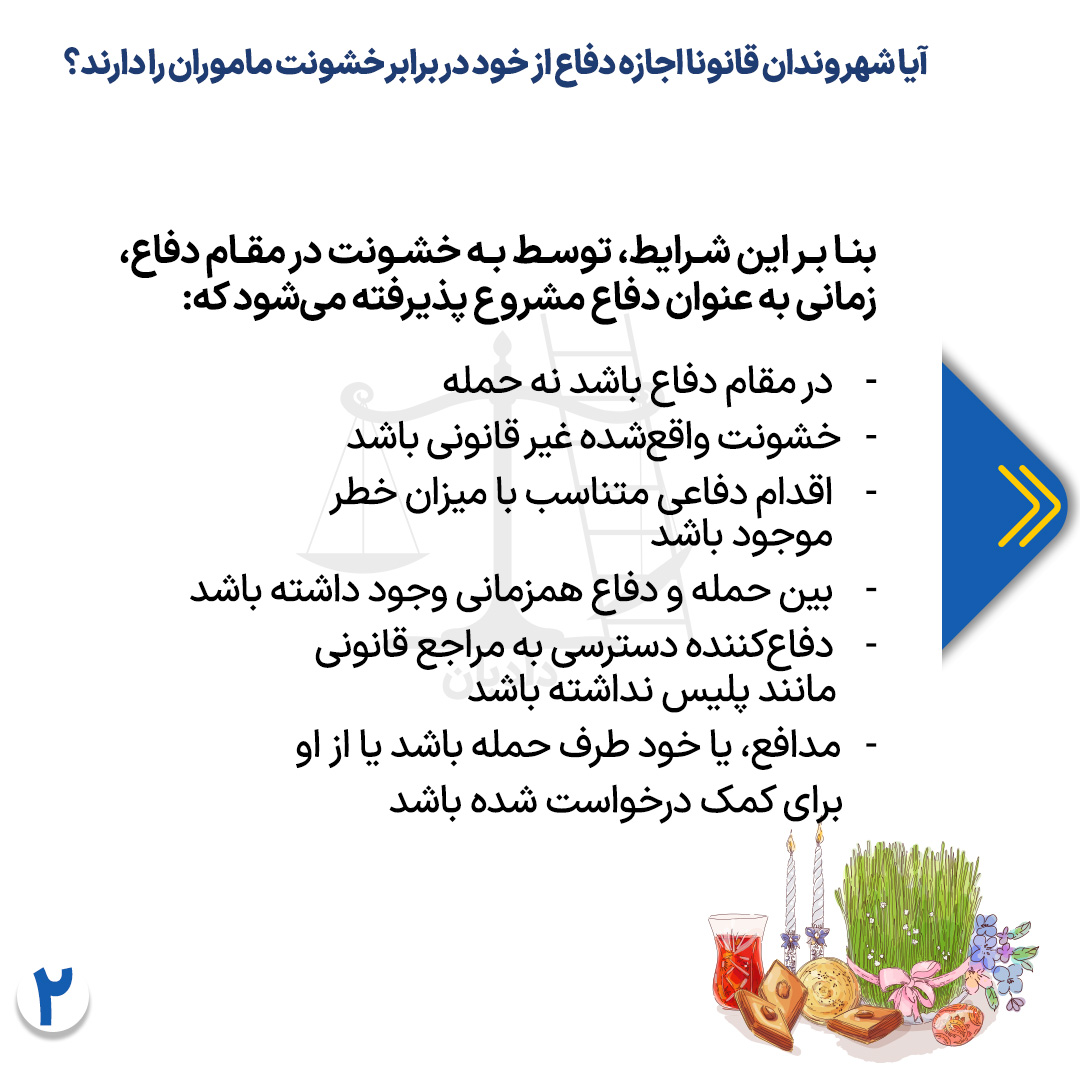 در پاسخ به این سوال باید گفت اگرچه حق دفاع مشروع در ماده ۱۵۶ قانون مجازات اسلامی برای همه شهروندان در برابر هرگونه خشونت غیر قانونی به رسمیت شناخته شده است، اما استفاده از این حق تابع شرایط قانونی ویژهای است.