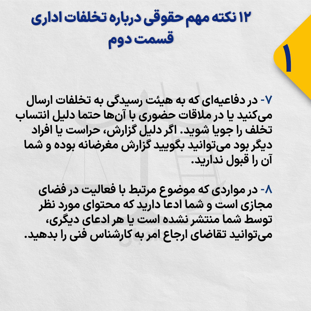 ۸- در مواردی که موضوع مرتبط با فعالیت در فضای مجازی است و شما ادعا دارید که محتوای مورد نظر توسط شما منتشر نشده است یا هر ادعای دیگری، میتوانید تقاضای ارجاع امر به کارشناس فنی را بدهید.